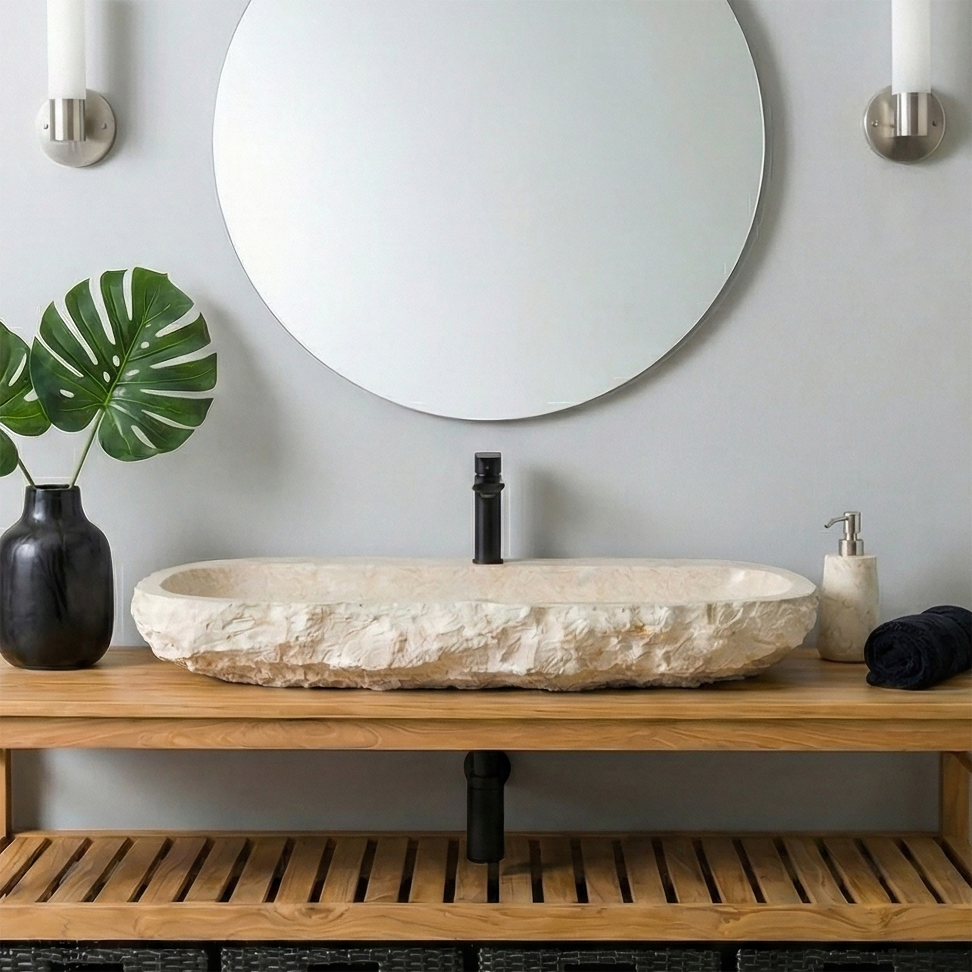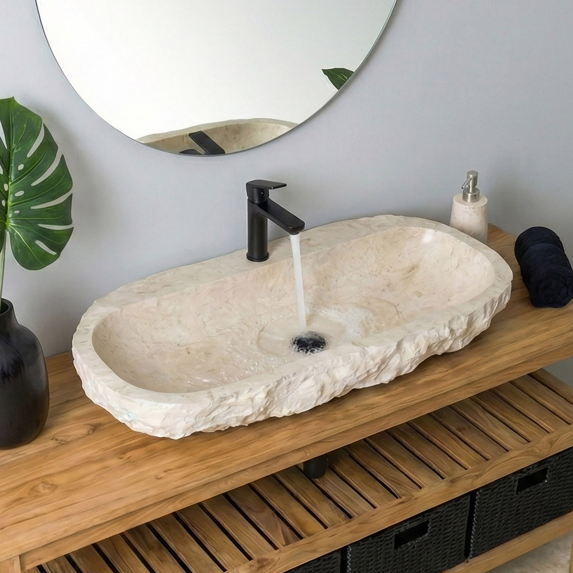 Dieses hochwertige Waschbecken aus massivem Naturmarmor verbindet zeitlose Eleganz mit funktionalem Design. Die gerade Rückwand mit integriertem Hahnloch sorgt für eine einfache Montage, während die außen naturbelassene Oberfläche den ursprünglichen Charakter des Steins bewahrt. Im Inneren überzeugt das Becken mit einer fein polierten Fläche für angenehme Haptik und leichte Reinigung. Jedes Stück ist ein Unikat und verleiht deinem Bad eine exklusive, natürliche Note.