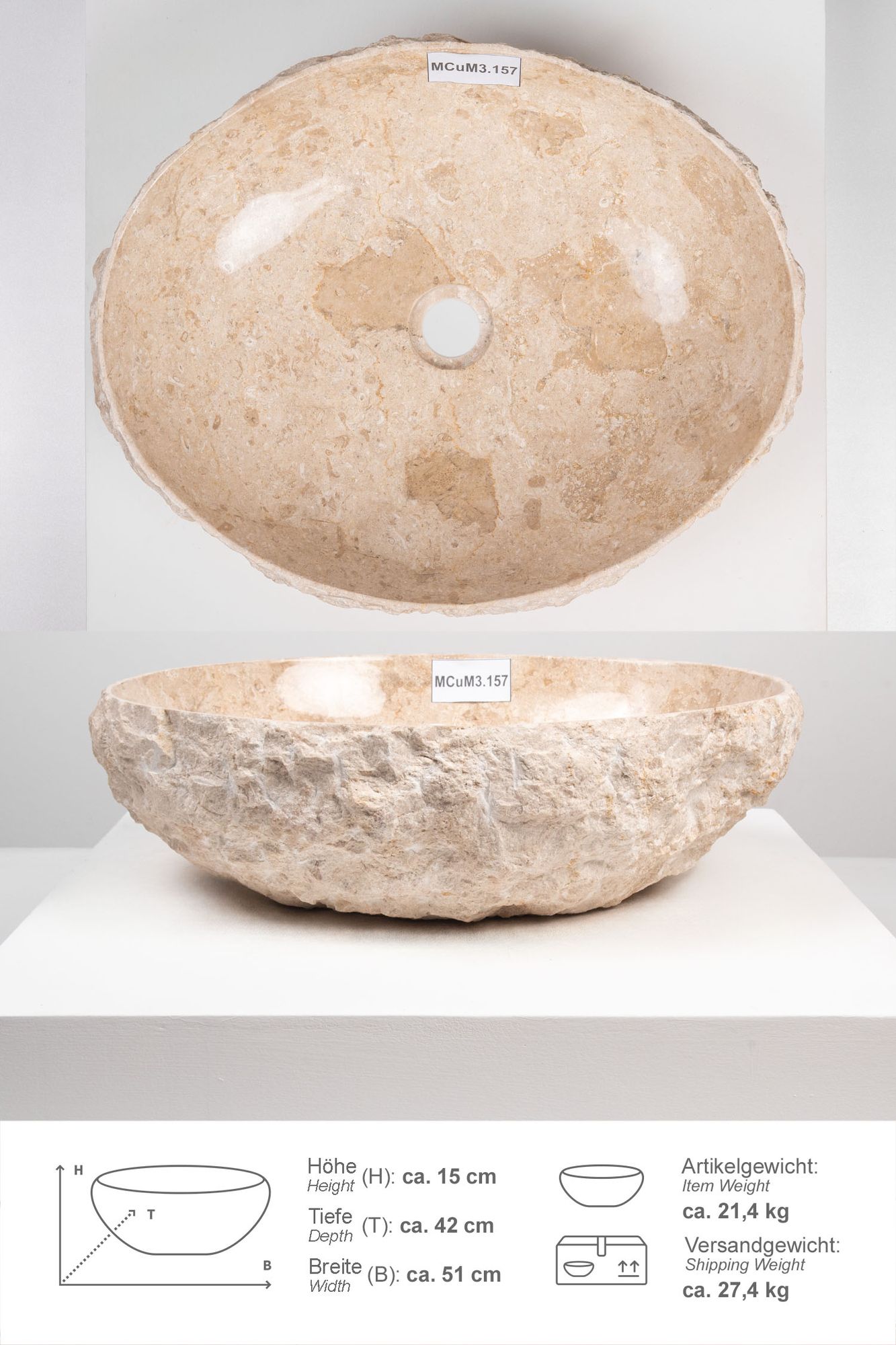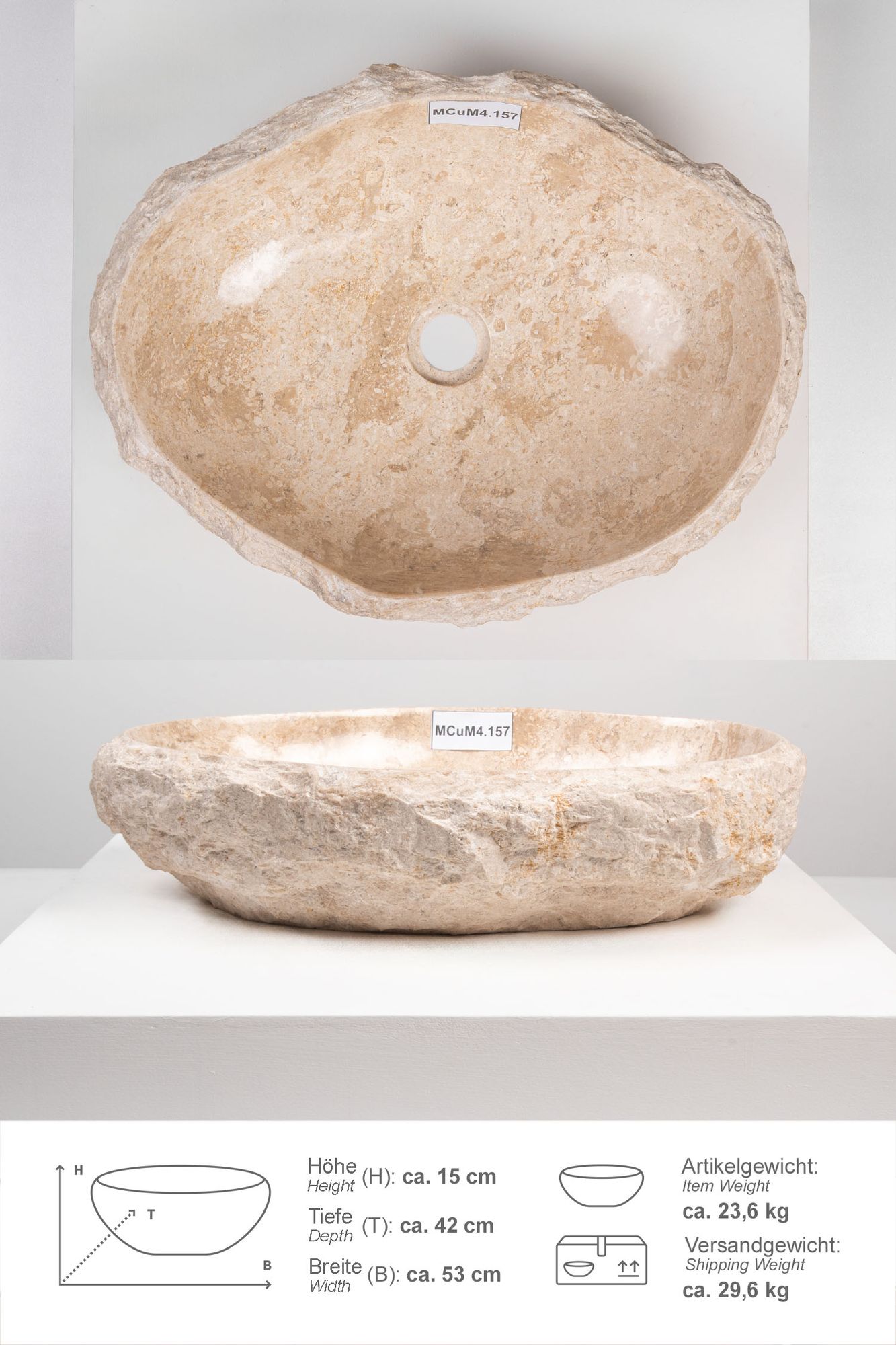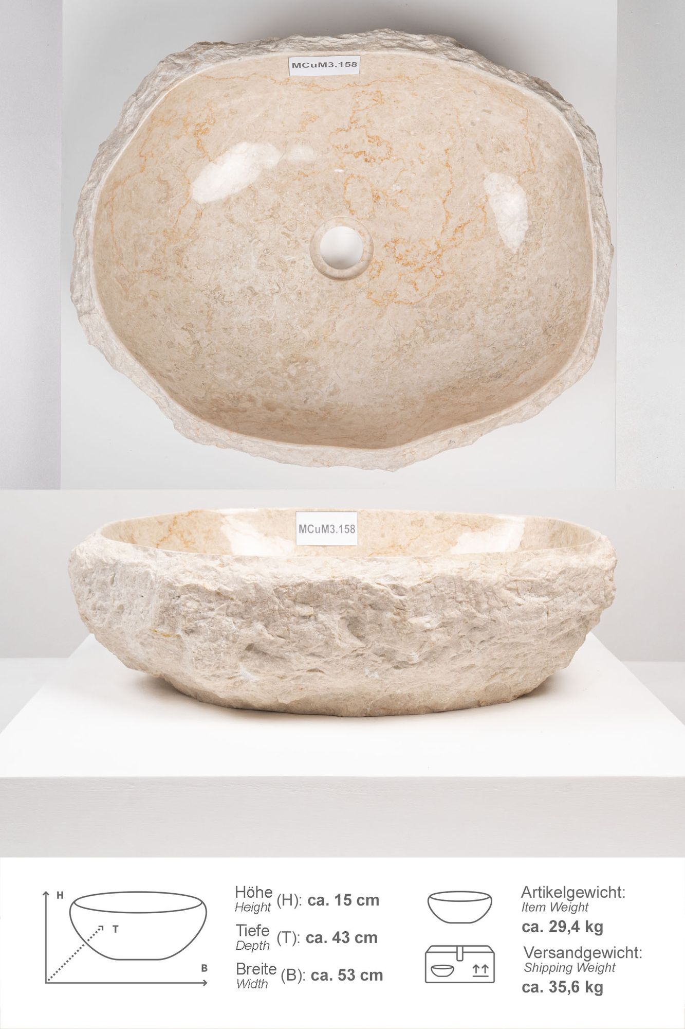 Erosi Marmor Waschbecken mit Naturkante 50 cm creme