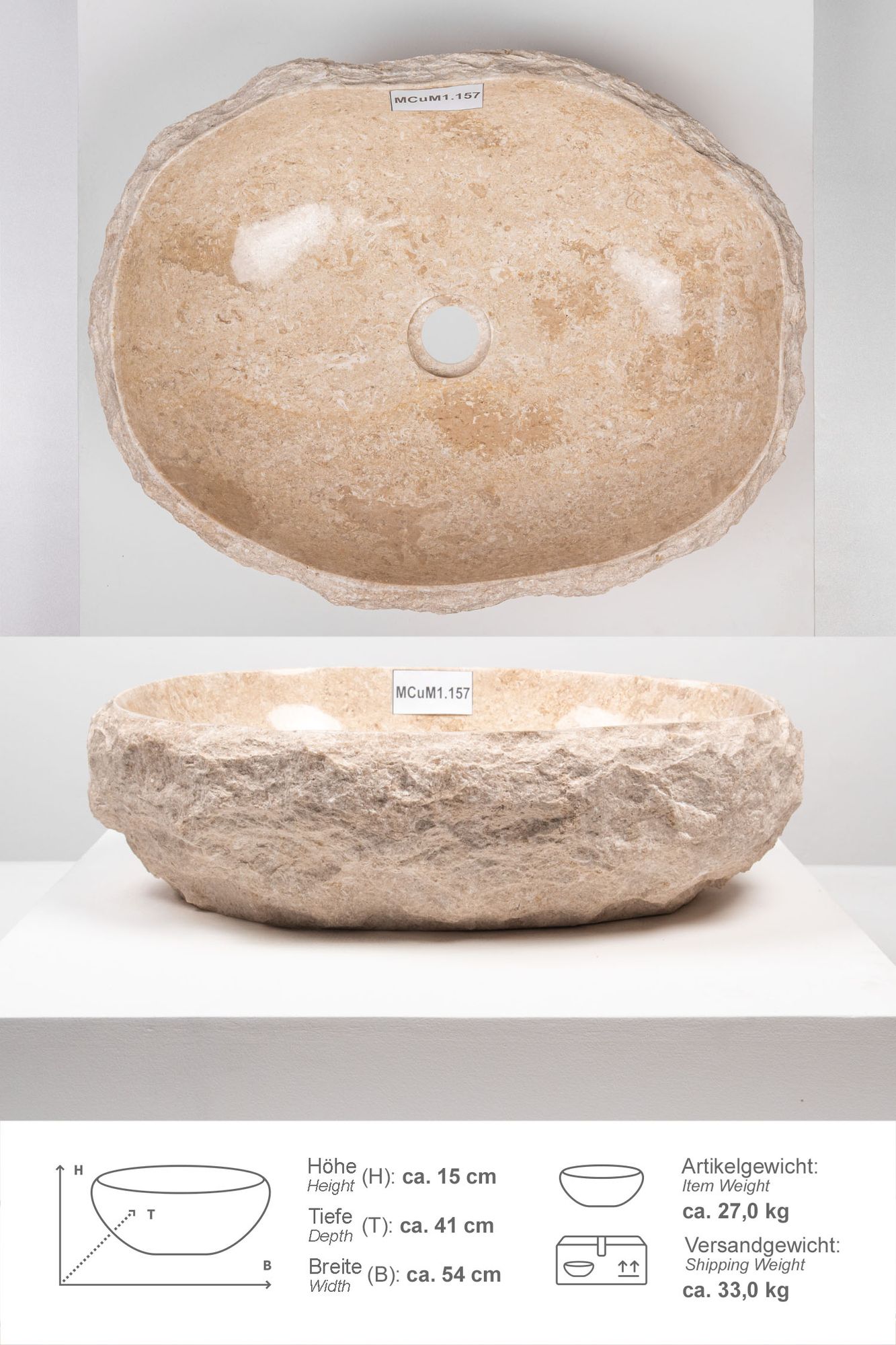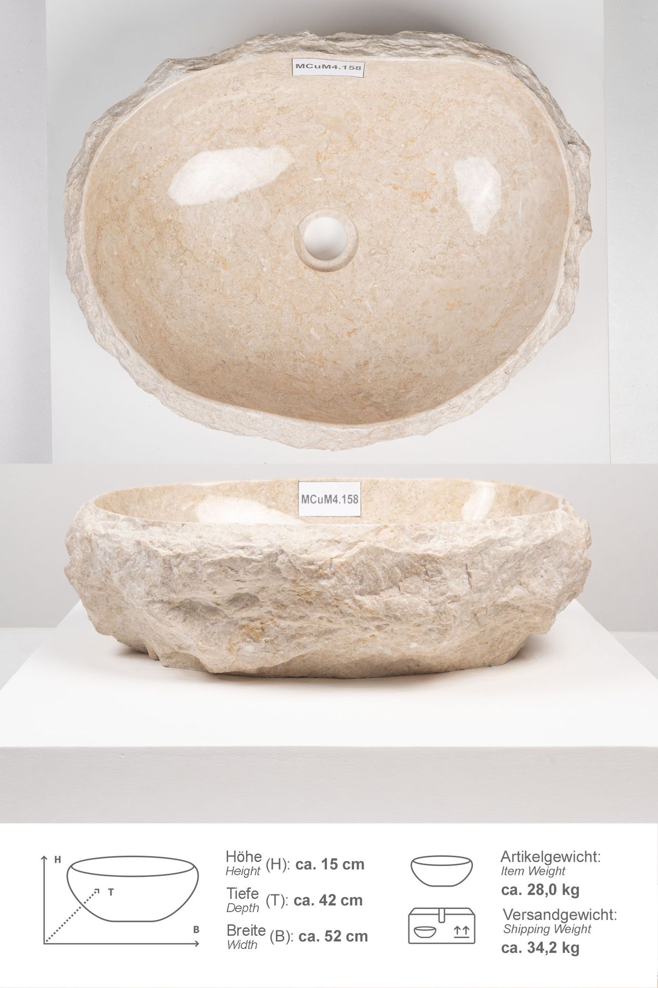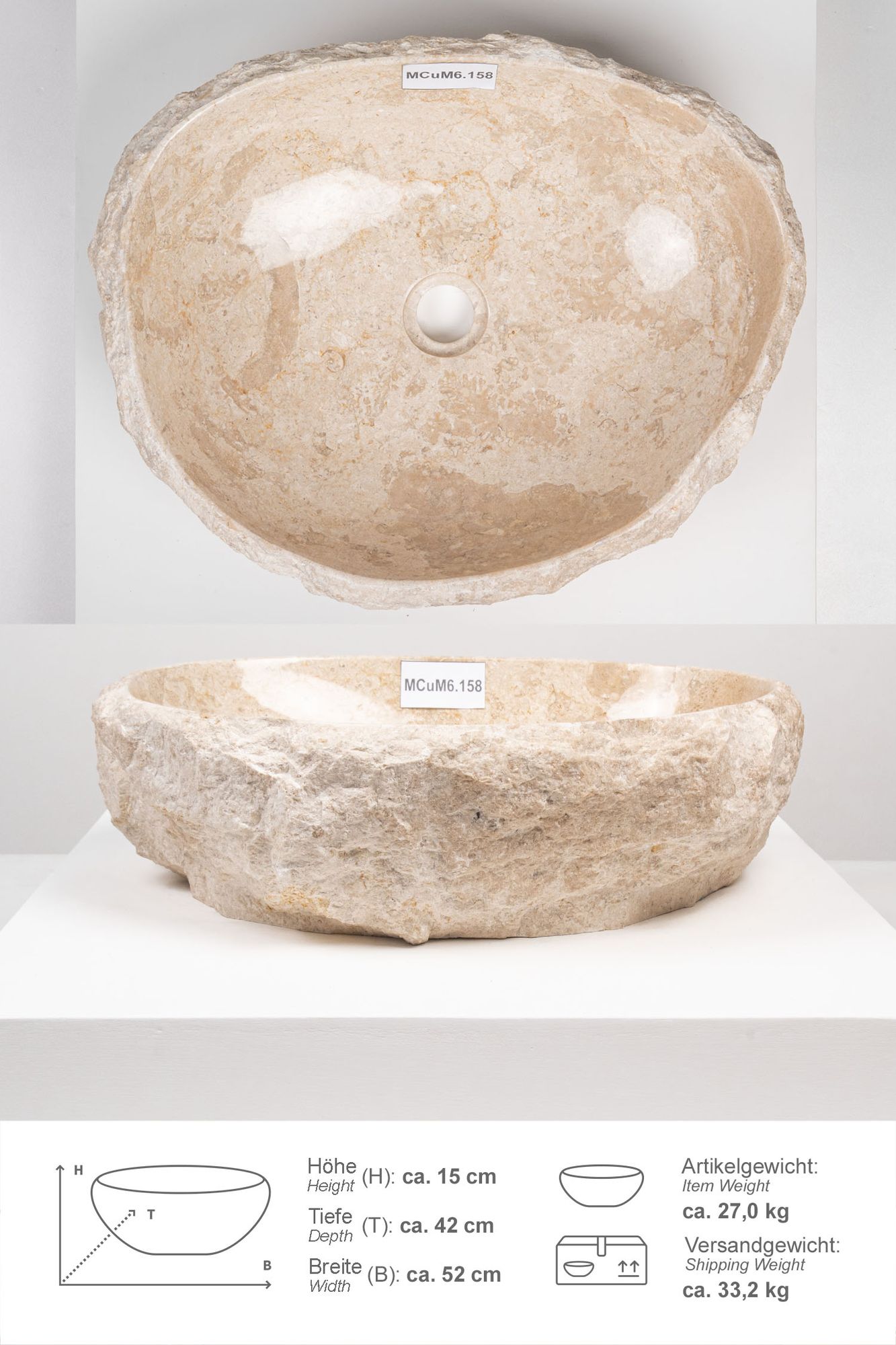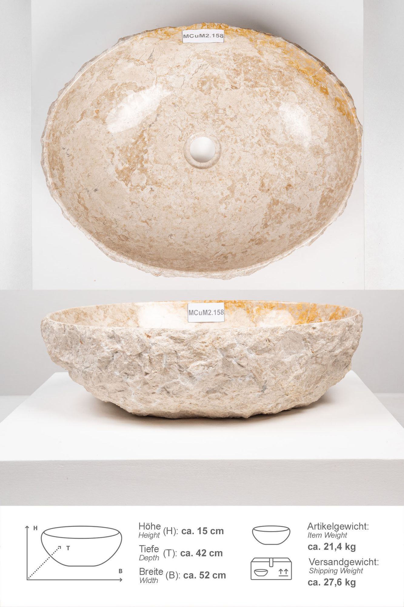 Erosi Marmor Waschbecken mit Naturkante 50 cm creme