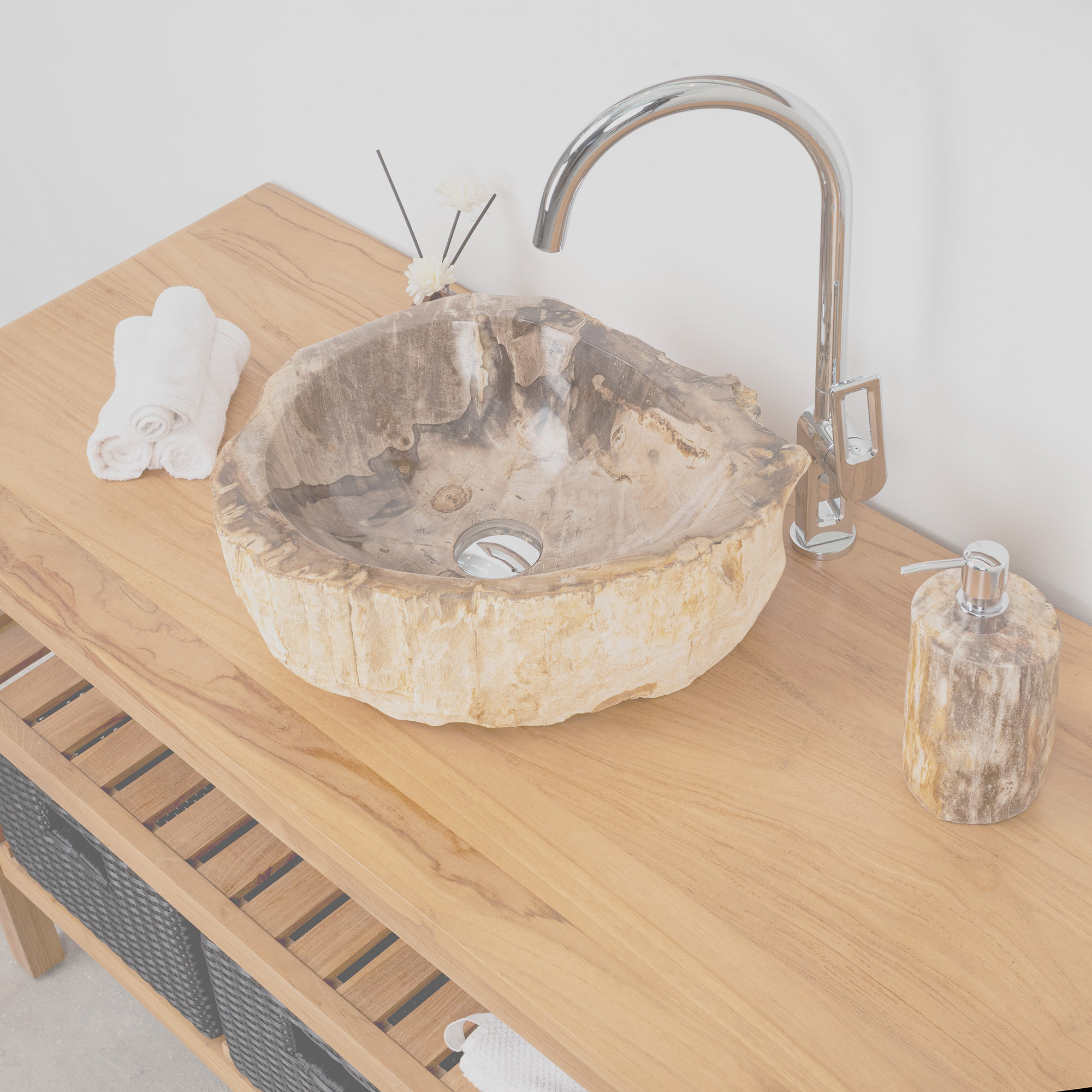 Verleihen Sie Ihrem Badezimmer einen Hauch von Exklusivität mit diesem atemberaubenden Waschbecken aus fossilem Holz. Dieses Naturstein-Waschbecken besticht durch seine beeindruckende Maserung und einzigartige Farbgebung, die in Millionen von Jahren entstanden ist. Versteinertes Holz ist ein faszinierendes Naturphänomen. Wenn Bäume in der Natur von Sedimenten oder vulkanischer Asche bedeckt werden, gelangt kein Sauerstoff mehr an das Holz. Im Laufe von Jahrmillionen wird das organische Material des Baumes langsam durch Mineralien wie Quarz, Kalzit oder Opal ersetzt. Dabei bleibt die ursprüngliche Struktur und Maserung des Holzes erstaunlich gut erhalten. Jedes Becken erzählt seine eigene Geschichte, die vor Millionen von Jahren begann. Die feinen Holzstrukturen und naturbelassenen Formen machen es zu einem echten Hingucker. Zudem ist versteinertes Holz extrem robust und widerstandsfähig gegenüber Wasser und täglichen Beanspruchungen.