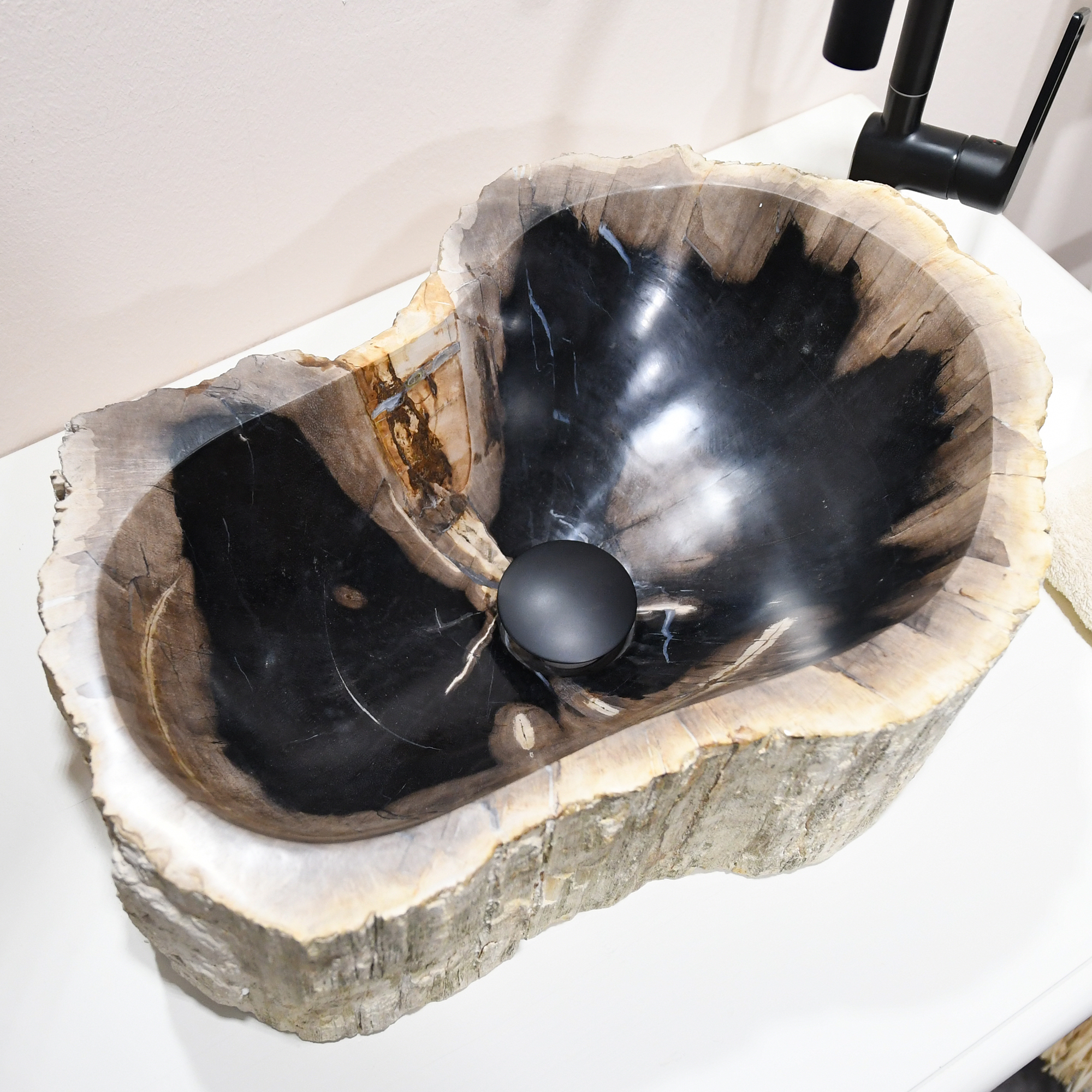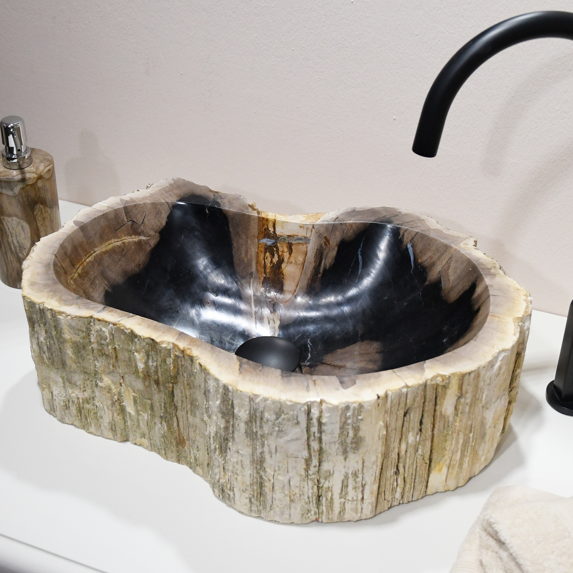 Verleihen Sie Ihrem Badezimmer einen Hauch von Exklusivität mit diesem atemberaubenden Waschbecken aus fossilem Holz. Dieses Naturstein-Waschbecken besticht durch seine beeindruckende Maserung und einzigartige Farbgebung, die in Millionen von Jahren entstanden ist. Versteinertes Holz ist ein faszinierendes Naturphänomen. Wenn Bäume in der Natur von Sedimenten oder vulkanischer Asche bedeckt werden, gelangt kein Sauerstoff mehr an das Holz. Im Laufe von Jahrmillionen wird das organische Material des Baumes langsam durch Mineralien wie Quarz, Kalzit oder Opal ersetzt. Dabei bleibt die ursprüngliche Struktur und Maserung des Holzes erstaunlich gut erhalten. Jedes Becken erzählt seine eigene Geschichte, die vor Millionen von Jahren begann. Die feinen Holzstrukturen und naturbelassenen Formen machen es zu einem echten Hingucker. Zudem ist versteinertes Holz extrem robust und widerstandsfähig gegenüber Wasser und täglichen Beanspruchungen.