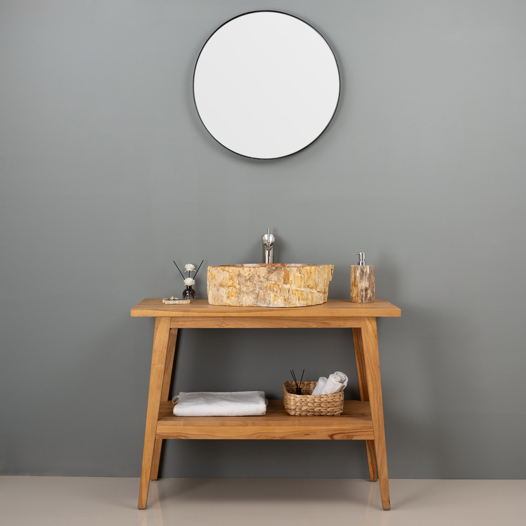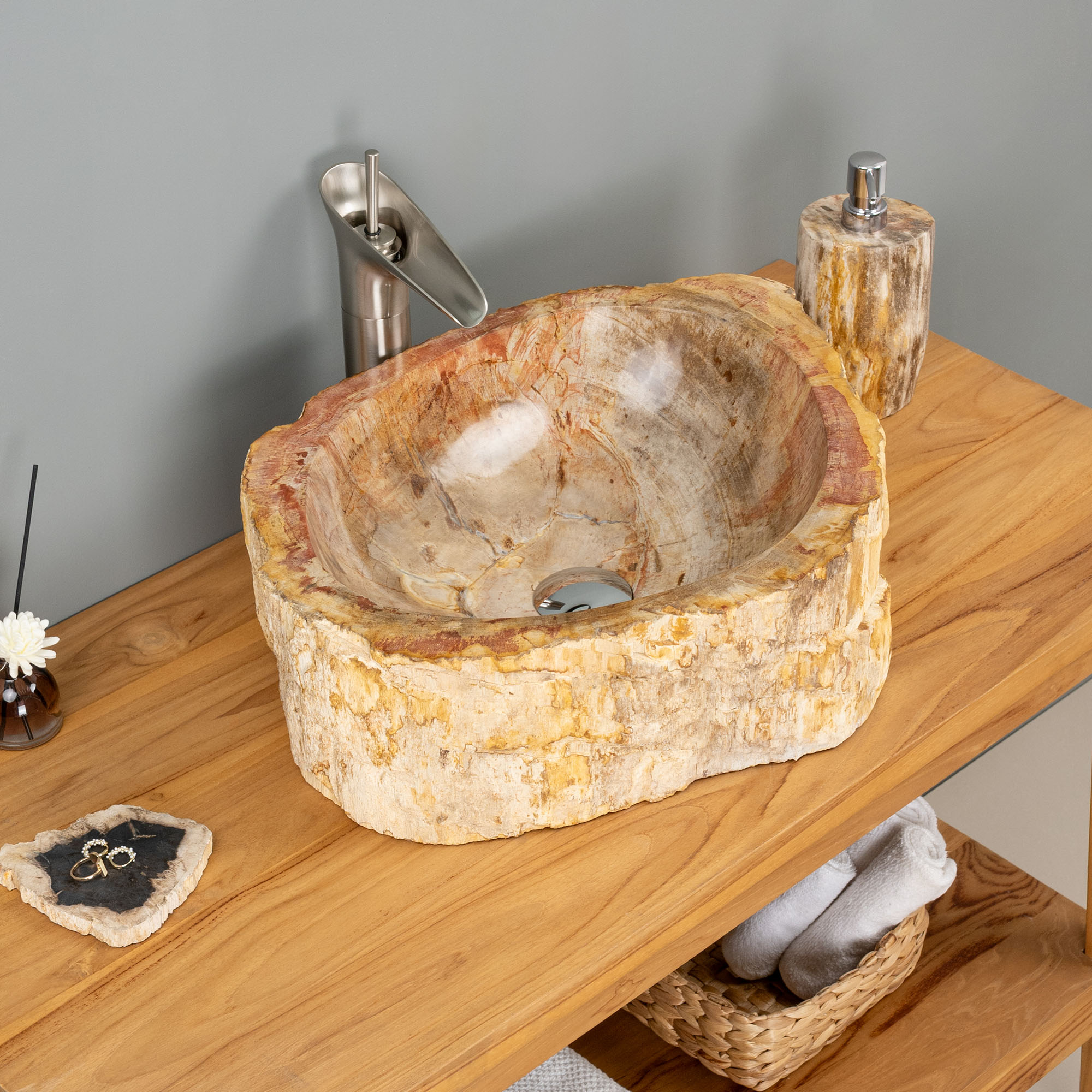 Verleihen Sie Ihrem Badezimmer einen Hauch von Exklusivität mit diesem atemberaubenden Waschbecken aus fossilem Holz. Dieses Naturstein-Waschbecken besticht durch seine beeindruckende Maserung und einzigartige Farbgebung, die in Millionen von Jahren entstanden ist. Versteinertes Holz ist ein faszinierendes Naturphänomen. Wenn Bäume in der Natur von Sedimenten oder vulkanischer Asche bedeckt werden, gelangt kein Sauerstoff mehr an das Holz. Im Laufe von Jahrmillionen wird das organische Material des Baumes langsam durch Mineralien wie Quarz, Kalzit oder Opal ersetzt. Dabei bleibt die ursprüngliche Struktur und Maserung des Holzes erstaunlich gut erhalten. Jedes Becken erzählt seine eigene Geschichte, die vor Millionen von Jahren begann. Die feinen Holzstrukturen und naturbelassenen Formen machen es zu einem echten Hingucker. Zudem ist versteinertes Holz extrem robust und widerstandsfähig gegenüber Wasser und täglichen Beanspruchungen.