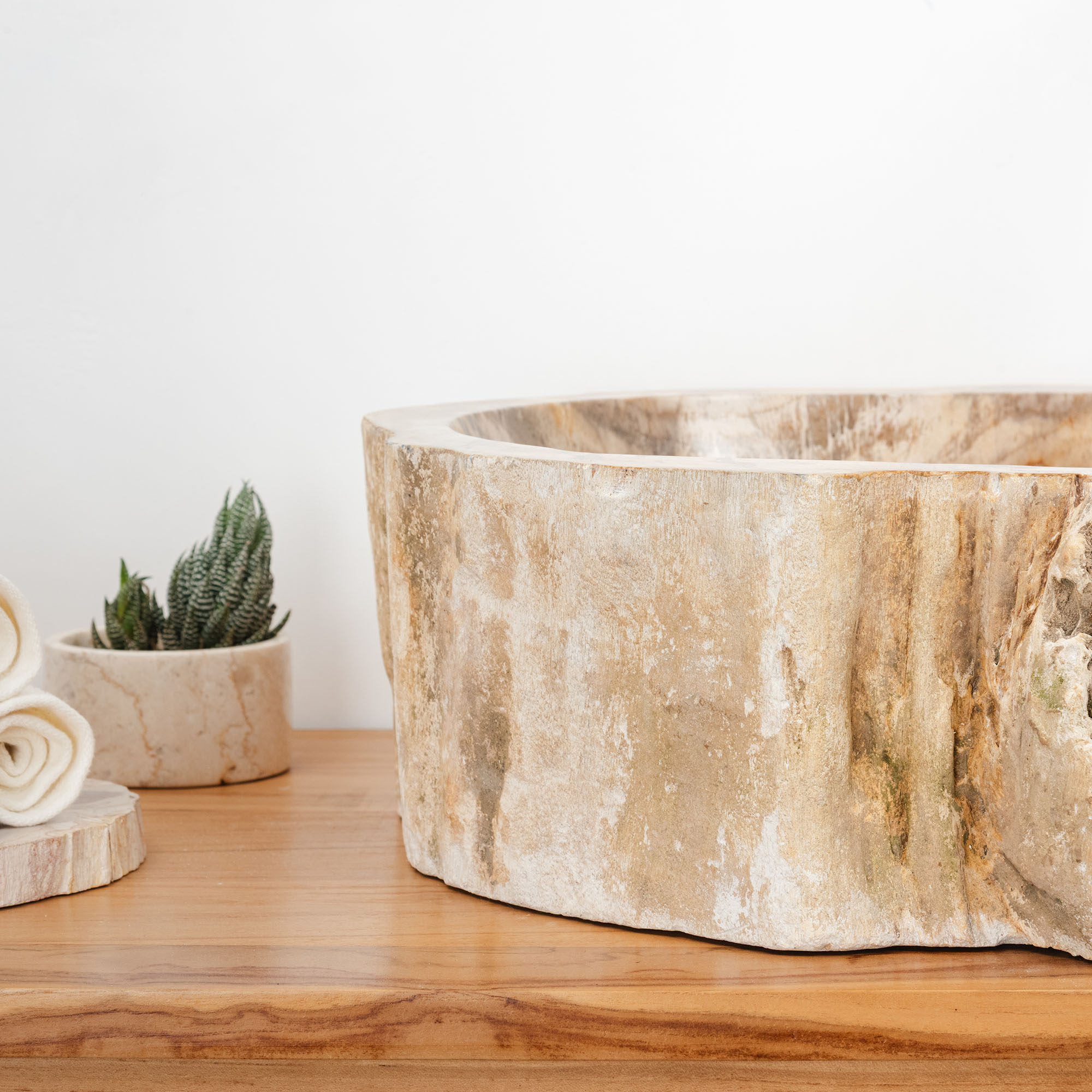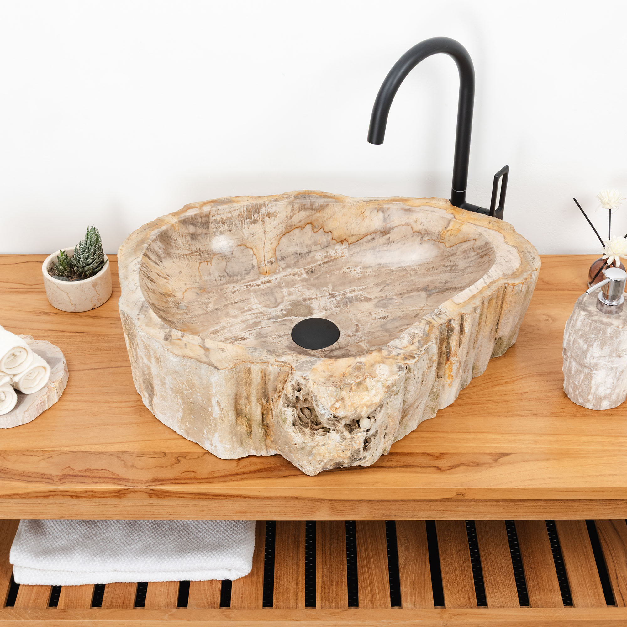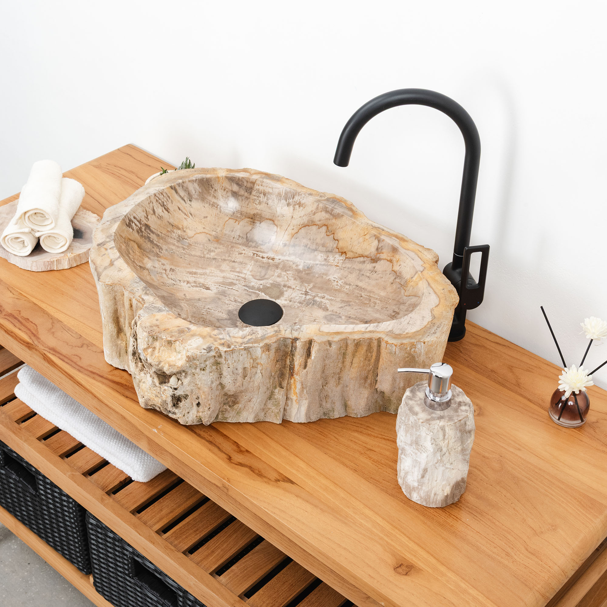 Verleihen Sie Ihrem Badezimmer einen Hauch von Exklusivität mit diesem atemberaubenden Waschbecken aus fossilem Holz. Dieses Naturstein-Waschbecken besticht durch seine beeindruckende Maserung und einzigartige Farbgebung, die in Millionen von Jahren entstanden ist. Versteinertes Holz ist ein faszinierendes Naturphänomen. Wenn Bäume in der Natur von Sedimenten oder vulkanischer Asche bedeckt werden, gelangt kein Sauerstoff mehr an das Holz. Im Laufe von Jahrmillionen wird das organische Material des Baumes langsam durch Mineralien wie Quarz, Kalzit oder Opal ersetzt. Dabei bleibt die ursprüngliche Struktur und Maserung des Holzes erstaunlich gut erhalten. Jedes Becken erzählt seine eigene Geschichte, die vor Millionen von Jahren begann. Die feinen Holzstrukturen und naturbelassenen Formen machen es zu einem echten Hingucker. Zudem ist versteinertes Holz extrem robust und widerstandsfähig gegenüber Wasser und täglichen Beanspruchungen.