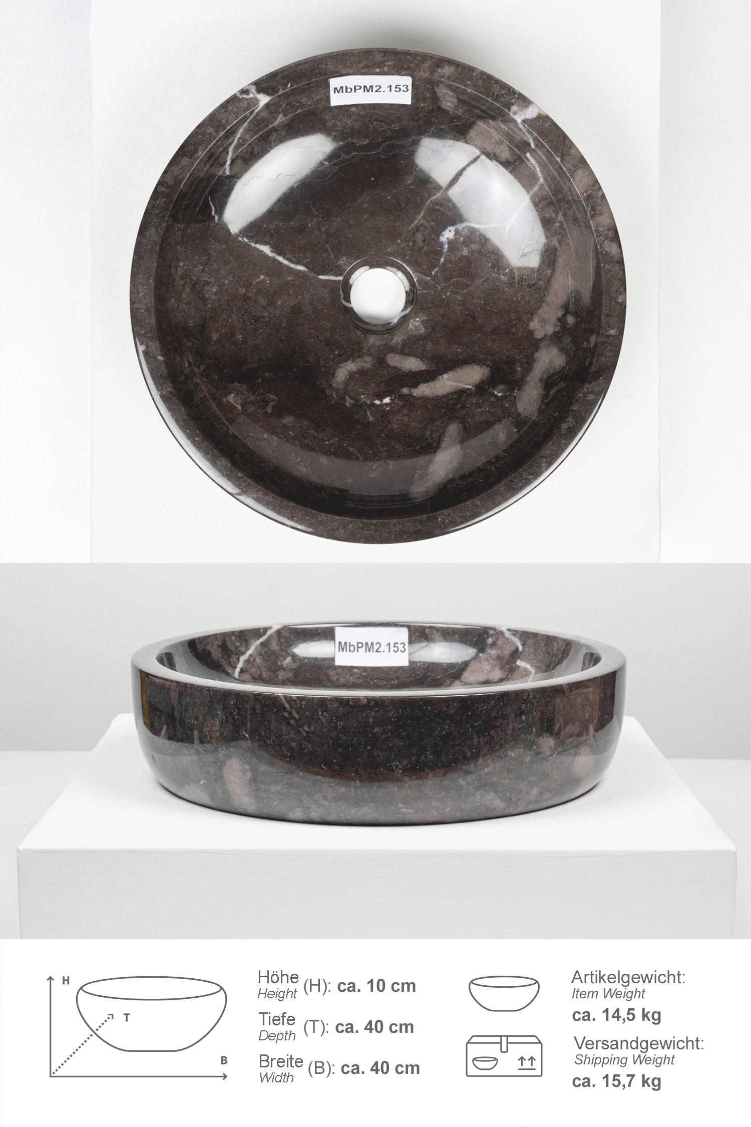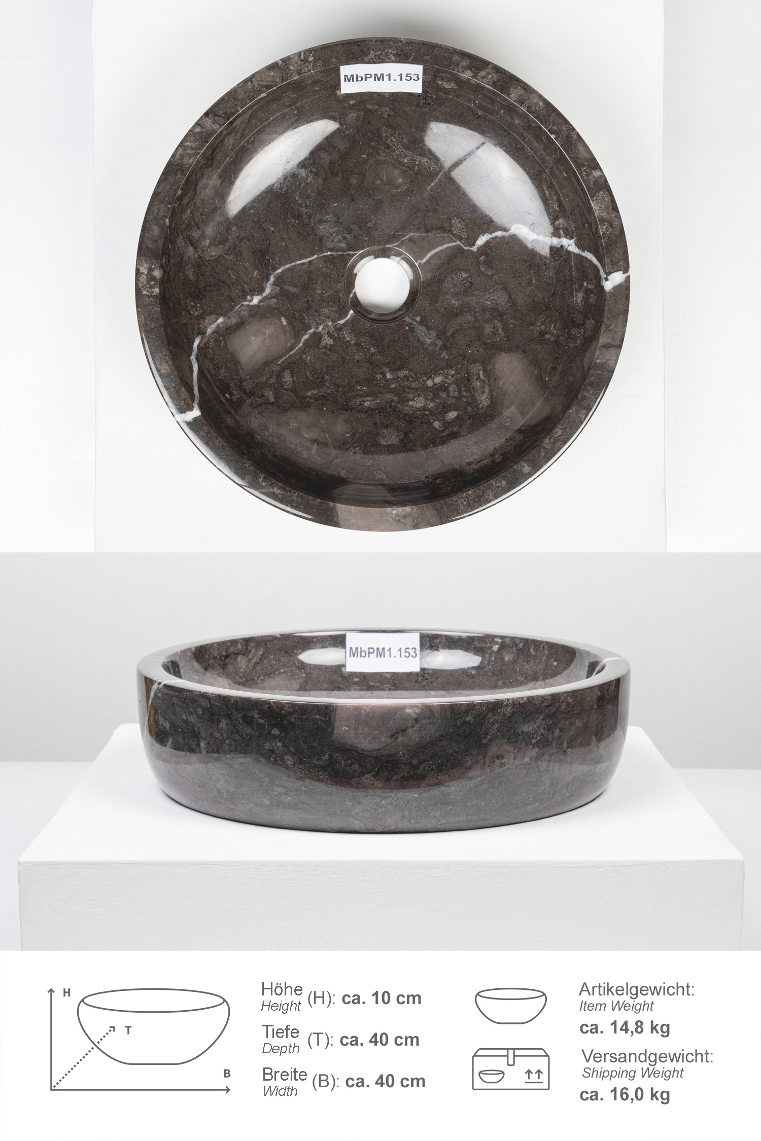 Sie erhalten ein Marmor Waschbecken MILO mit einem Durchmesser von ca. 40 cm. Der Unterschrank sowie die Armatur und das Ventil sind im Lieferumfang nicht enthalten. Je nach Bedarf finden Sie passendes Zubehör wie Armaturen und permanent geöffnete sowie Pop up- Ventile in unserem Shop.