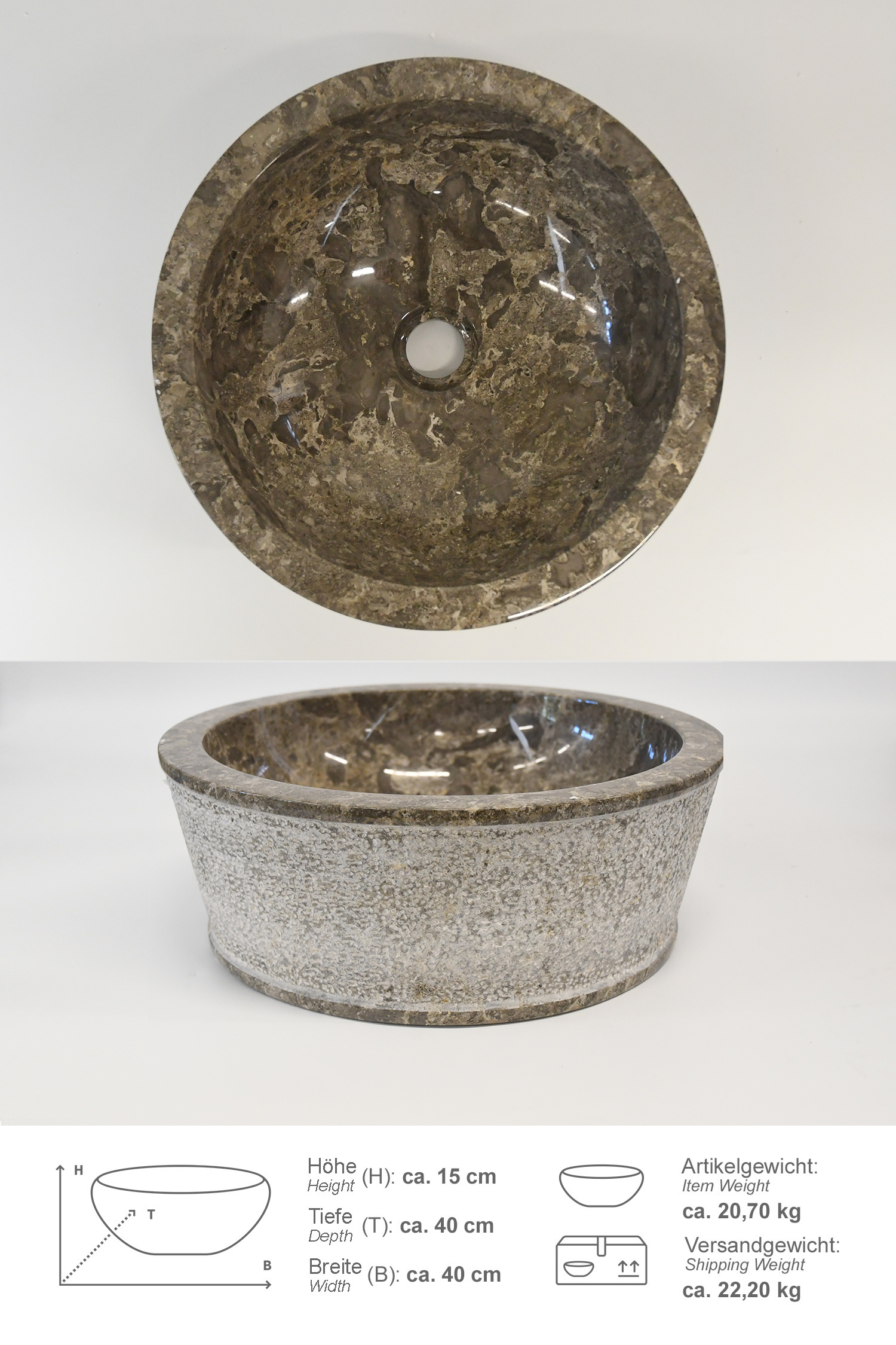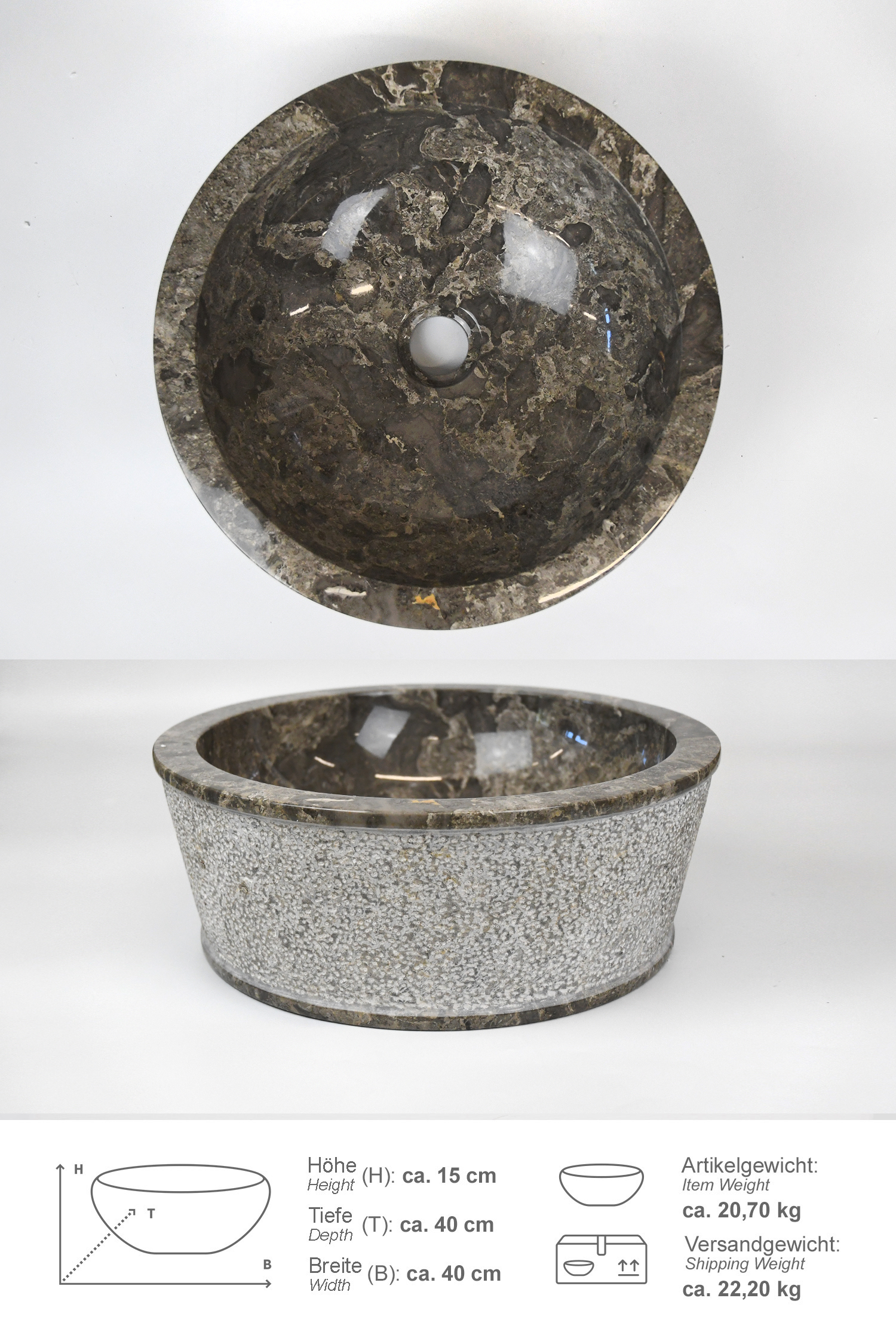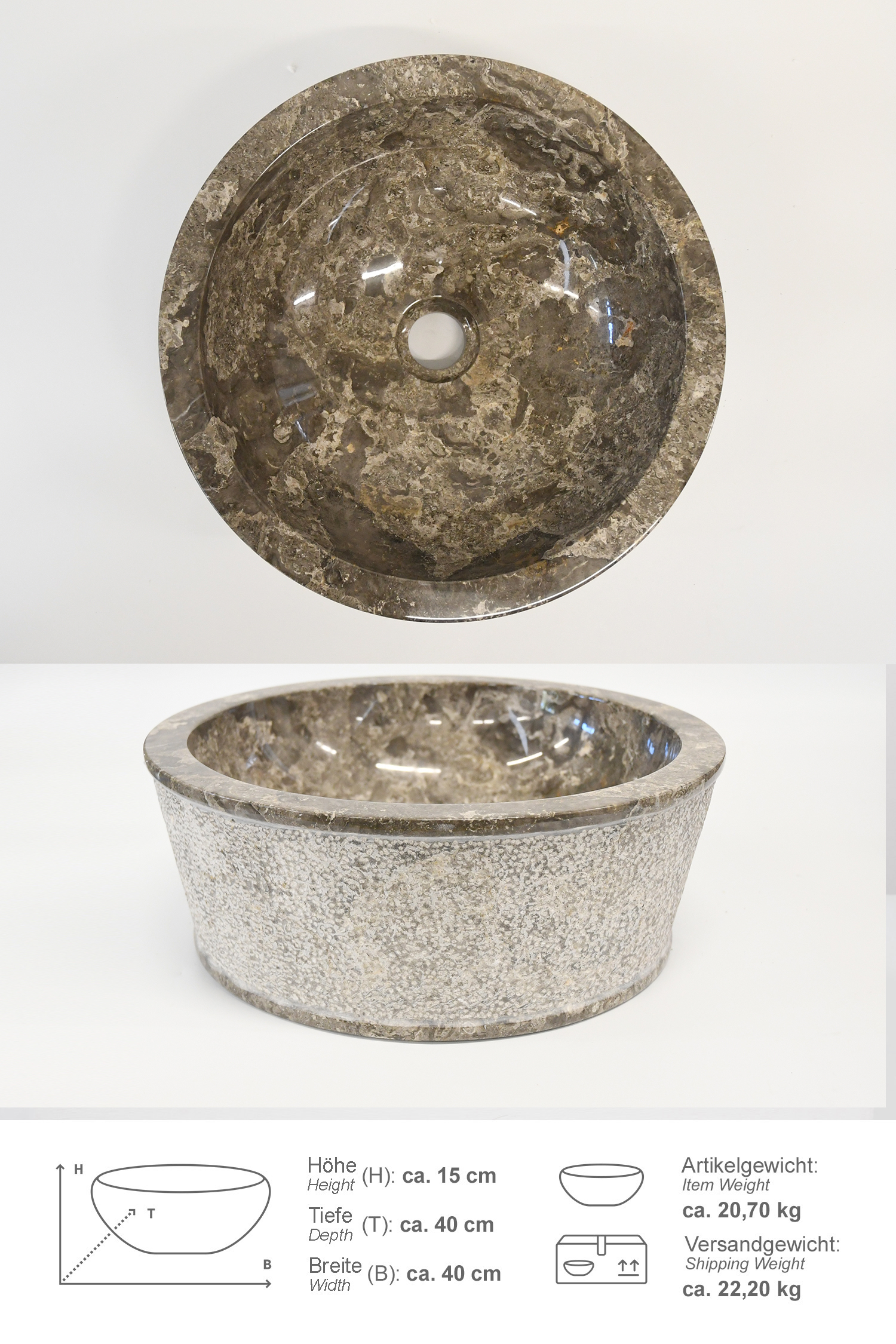 Das Waschbecken ist innen und außen von Hand poliert. Unterschiede in Marmorierung, Schattierung und Struktur sind das Zeichen für die Individualität eines jeden Waschbeckens. Bitte beachten Sie, dass unsere Waschbecken ohne Überlauf gearbeitet sind.