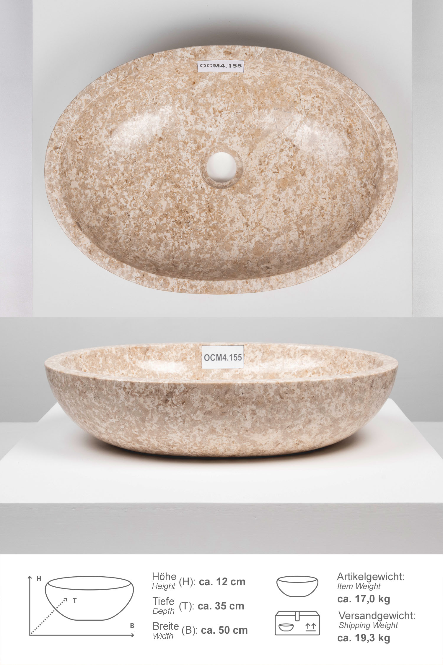 Das Waschbecken ist innen und außen von Hand poliert. Unterschiede in Marmorierung, Schattierung und Struktur sind das Zeichen für die Individualität eines jeden Waschbeckens. Bitte beachten Sie, dass unsere Waschbecken ohne Überlauf gearbeitet sind.