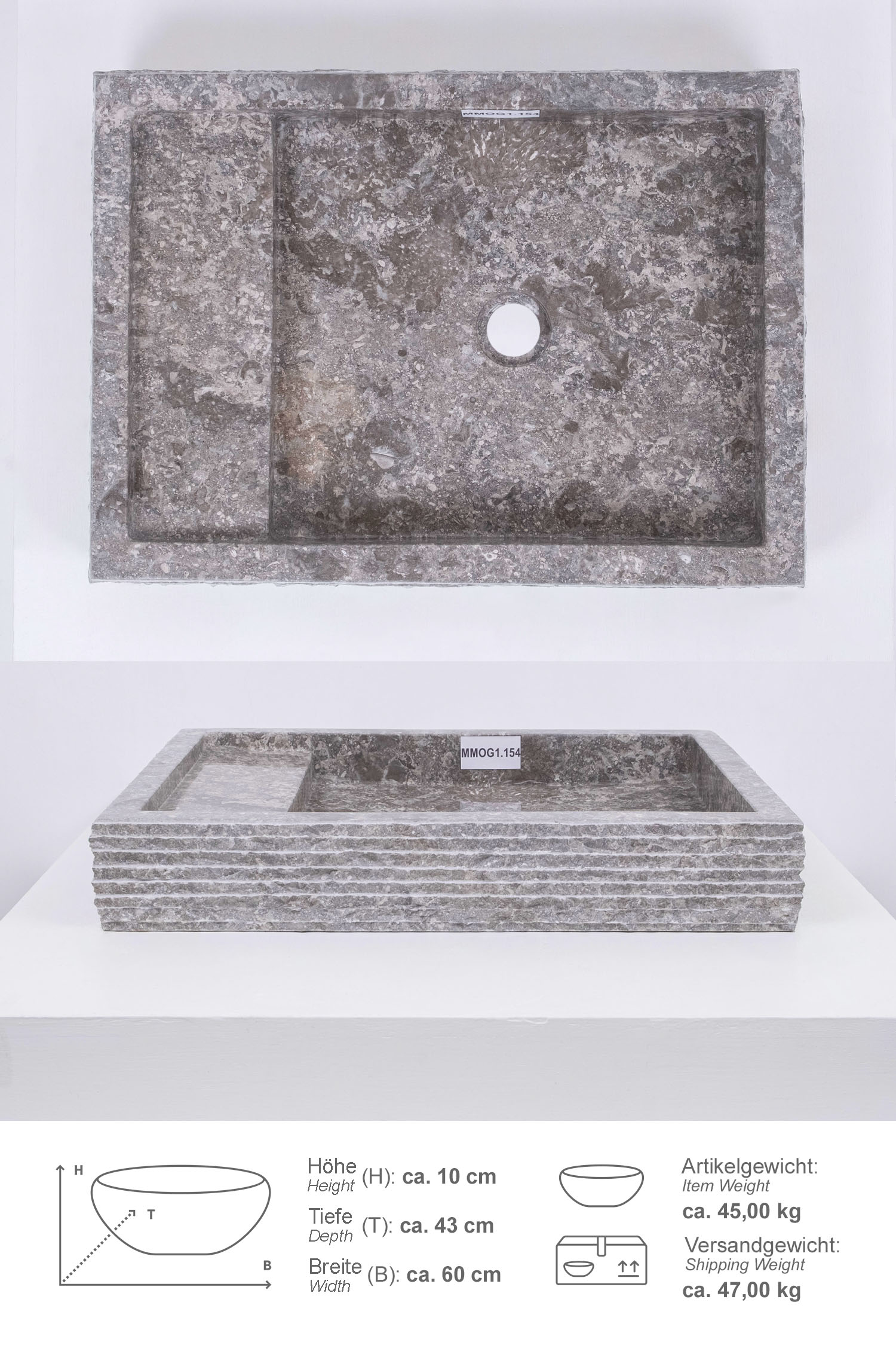 60 cm eckiges Steinwaschbecken MO 14 aus indonesischem Marmor in natürlichem Grauton