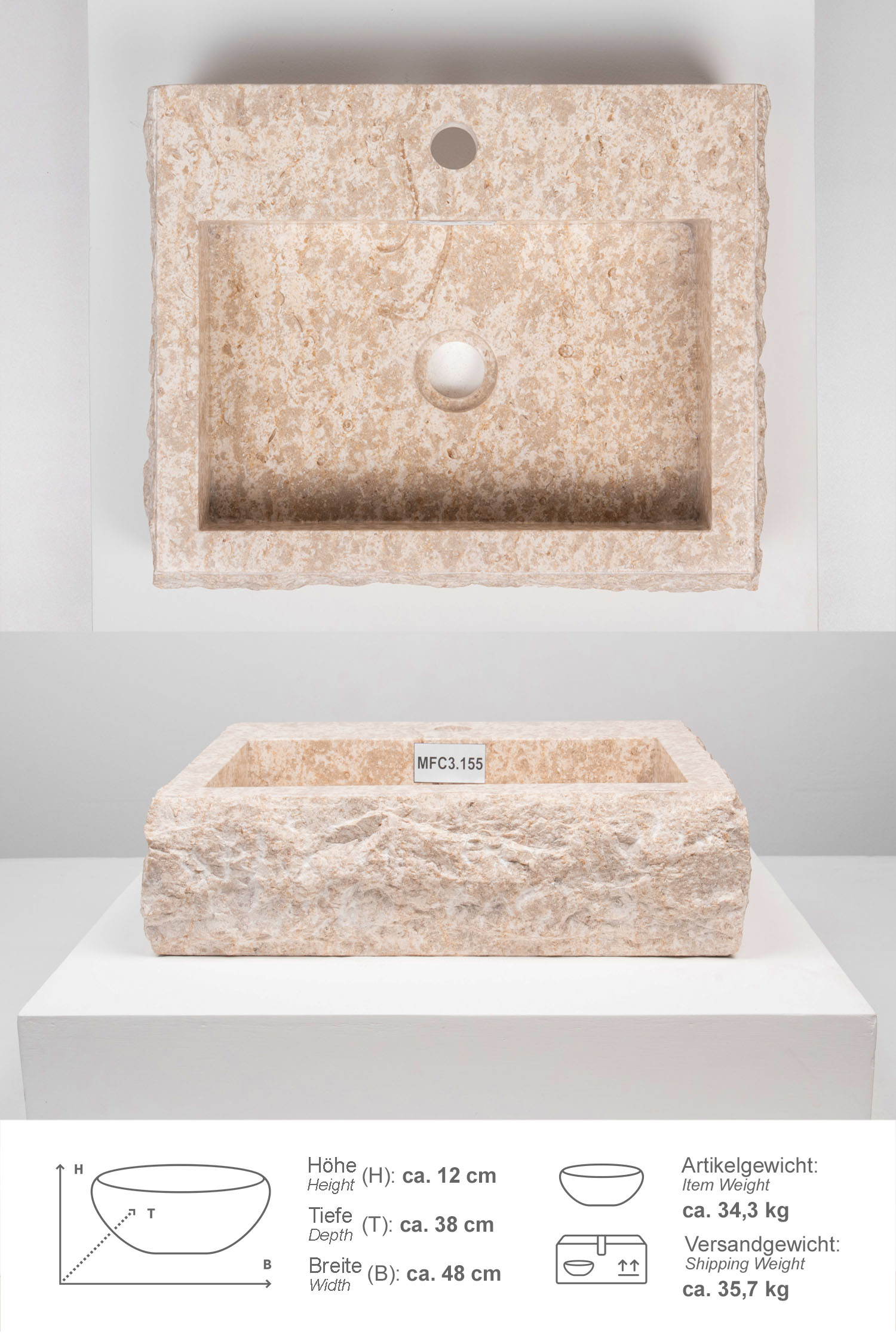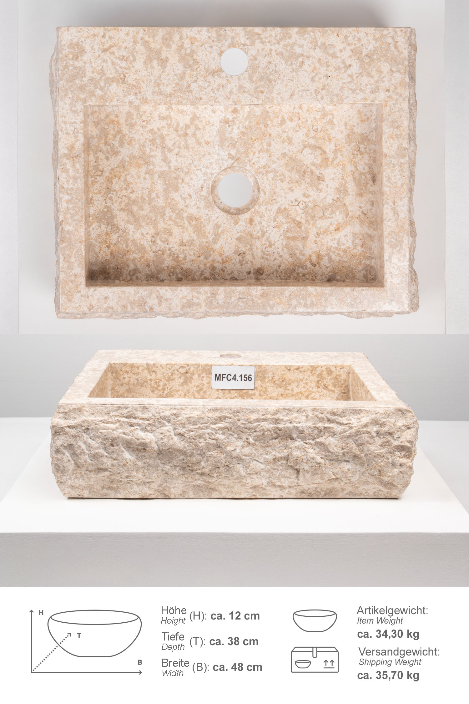 Ein Waschbecken aus indonesischem Marmor. Das Waschbecken ist innen von Hand poliert und außen gehämmert. Unterschiede in Marmorierung, Schattierung und Struktur sind das Zeichen für die Individualität eines jeden Waschbeckens.