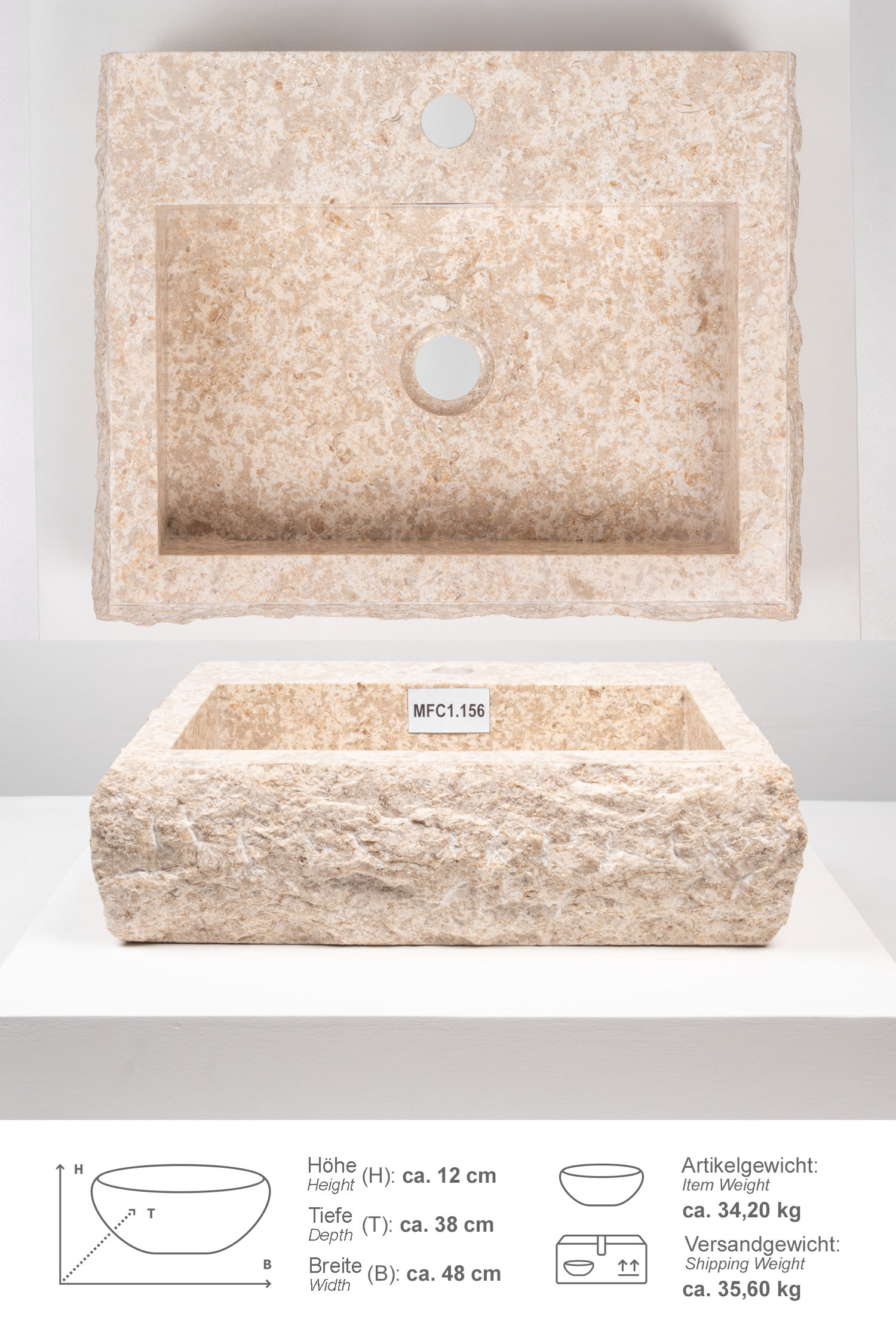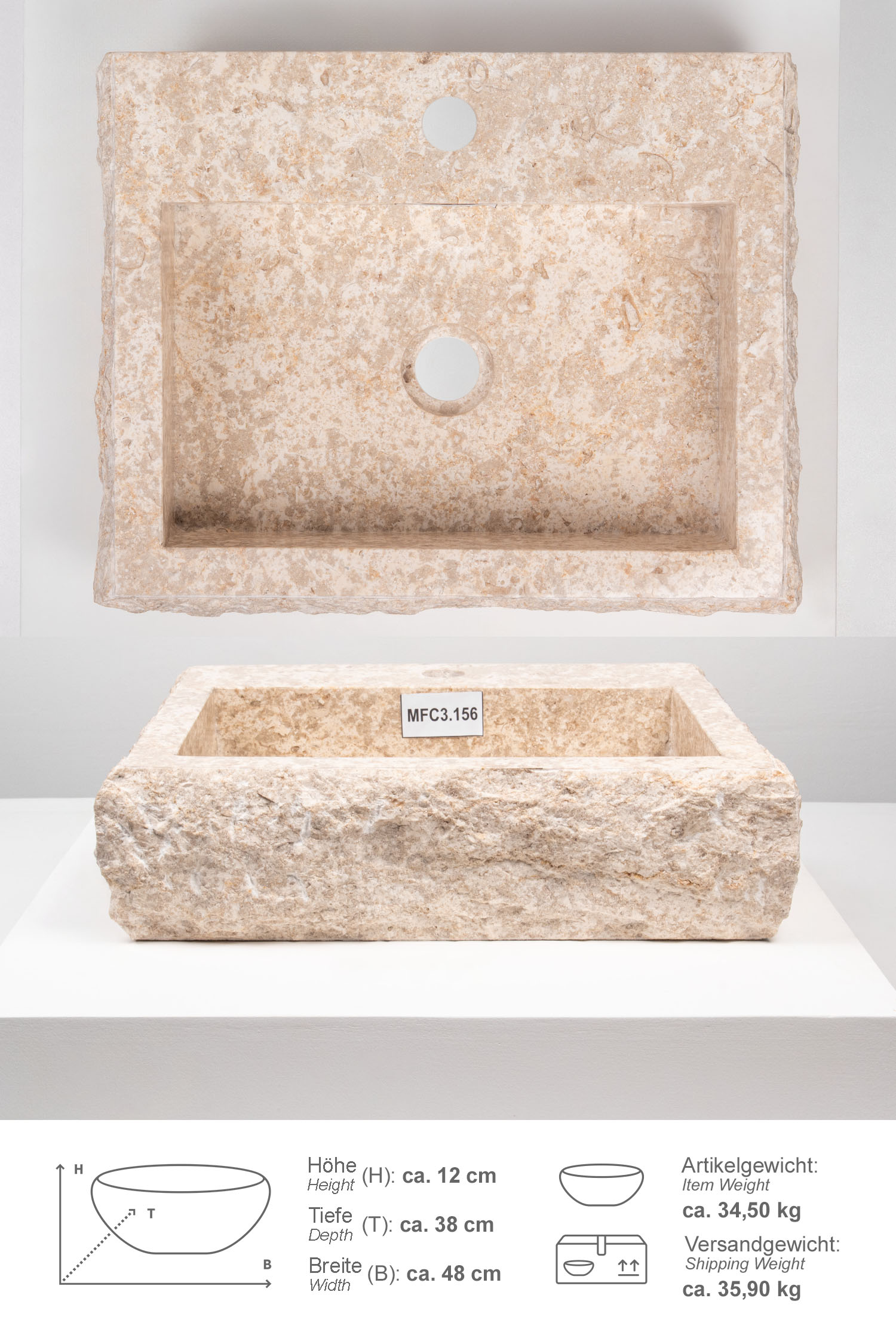 Marmor - Waschbecken MO 6 gehämmert- creme 48x38x12 cm