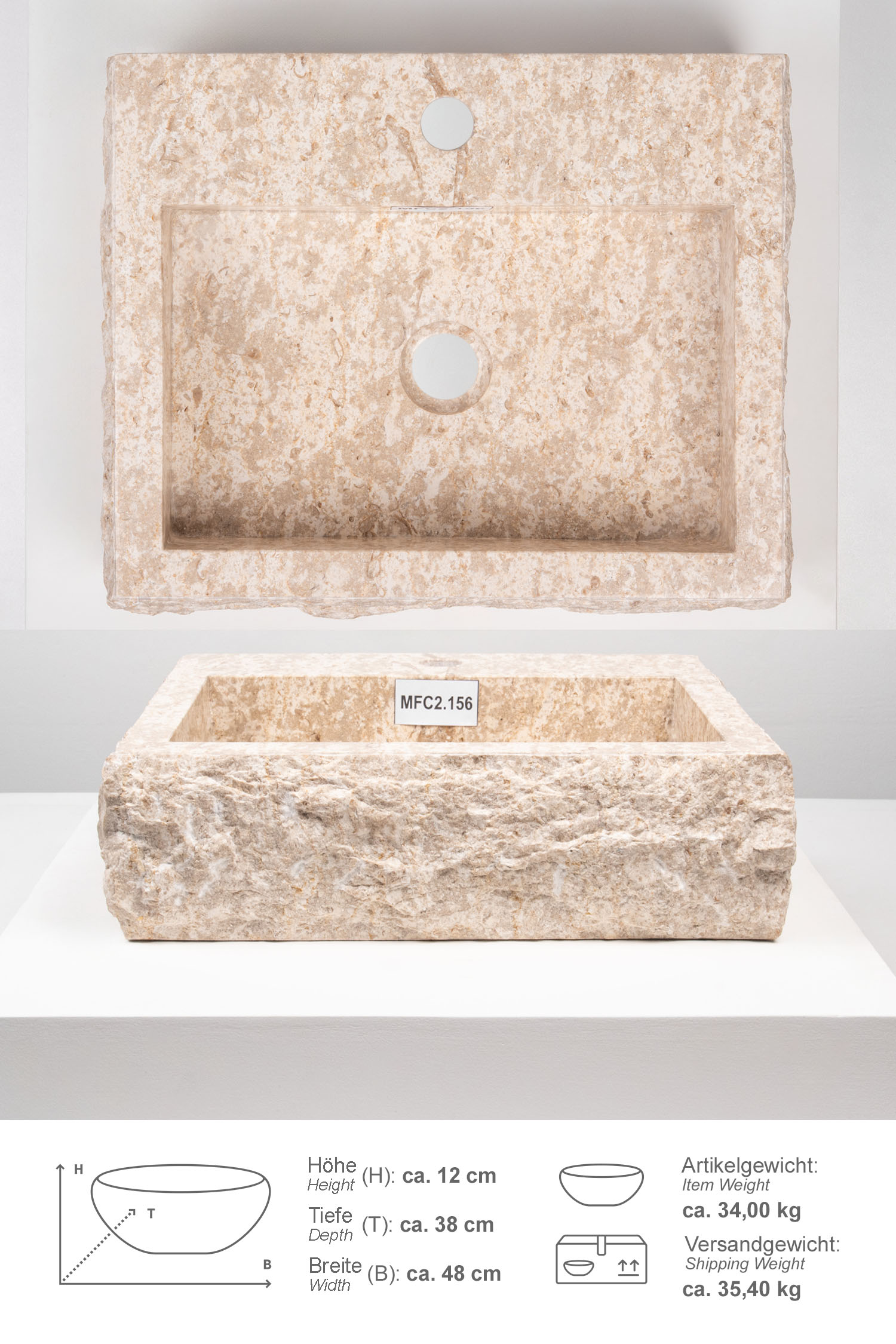 Das Waschbecken ist aus einem Marmorblock gefräst worden und von Hand geschlagen und mit der Flex-Maschine nachbearbeitet und poliert. Die Außenseite ist von Hand gehämmert worden und nicht noch einmal lasiert worden. Der weiße Schleier ist gewollt.