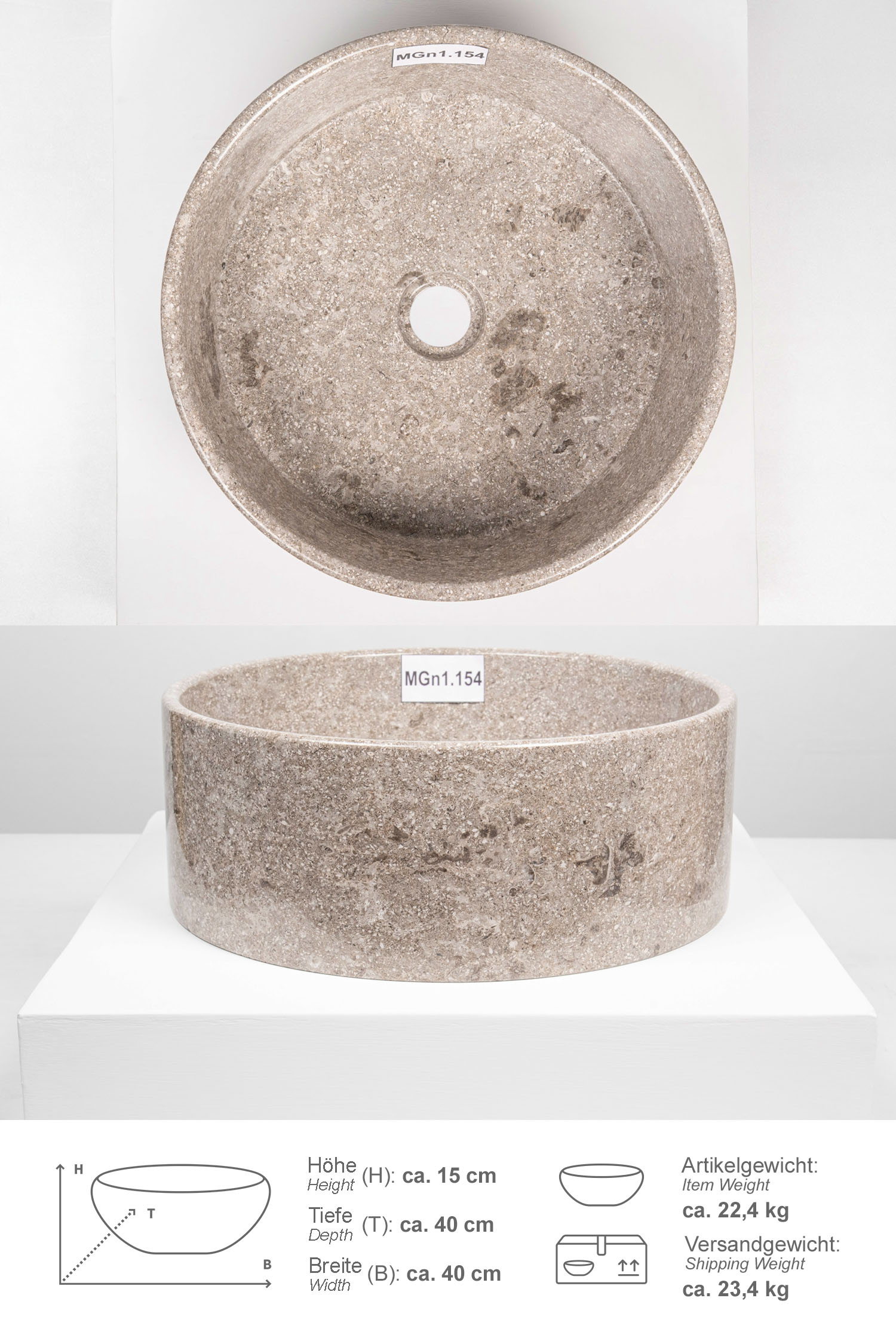 Unterschiede in Marmorierung, Schattierung und Struktur sind das Zeichen für die Individualität eines jeden Waschbeckens. Bitte beachten Sie, dass unsere Waschbecken ohne Überlauf gearbeitet sind.