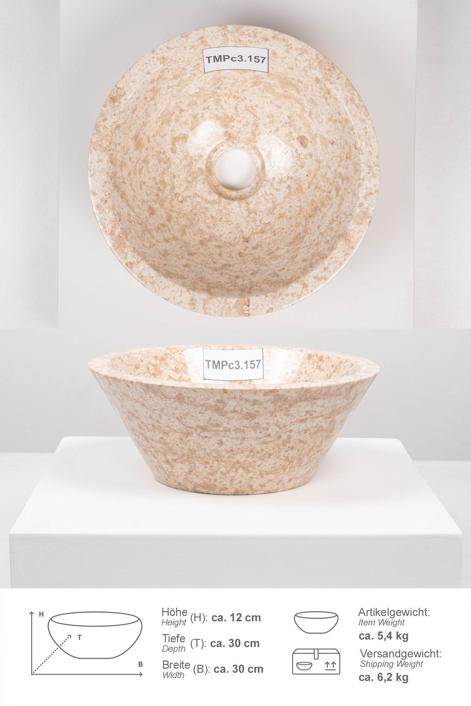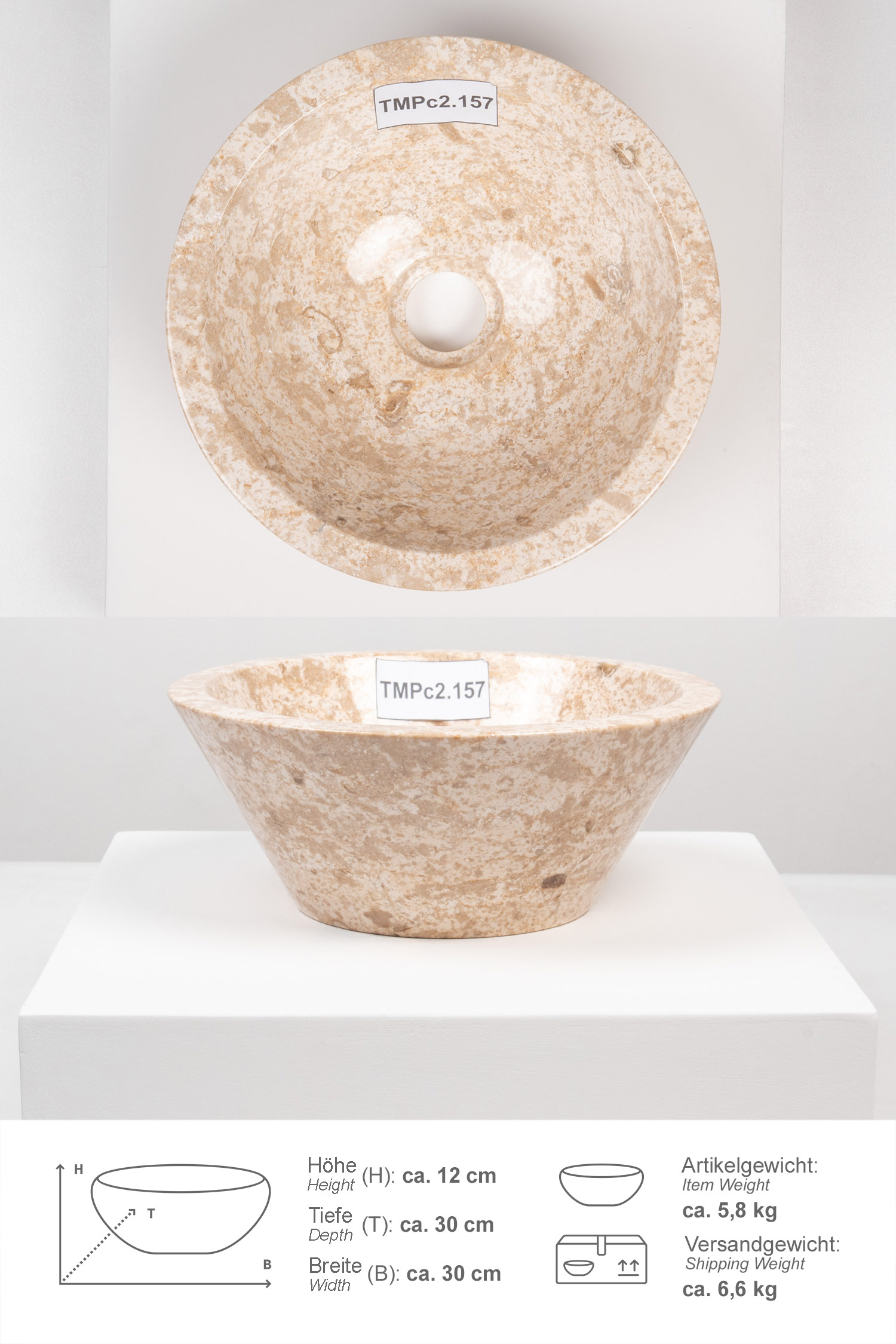 Das Waschbecken ist innen und außen von Hand poliert. Unterschiede in Marmorierung, Schattierung und Struktur sind das Zeichen für die Individualität eines jeden Waschbeckens. Bitte beachten Sie, dass unsere Waschbecken ohne Überlauf gearbeitet sind.