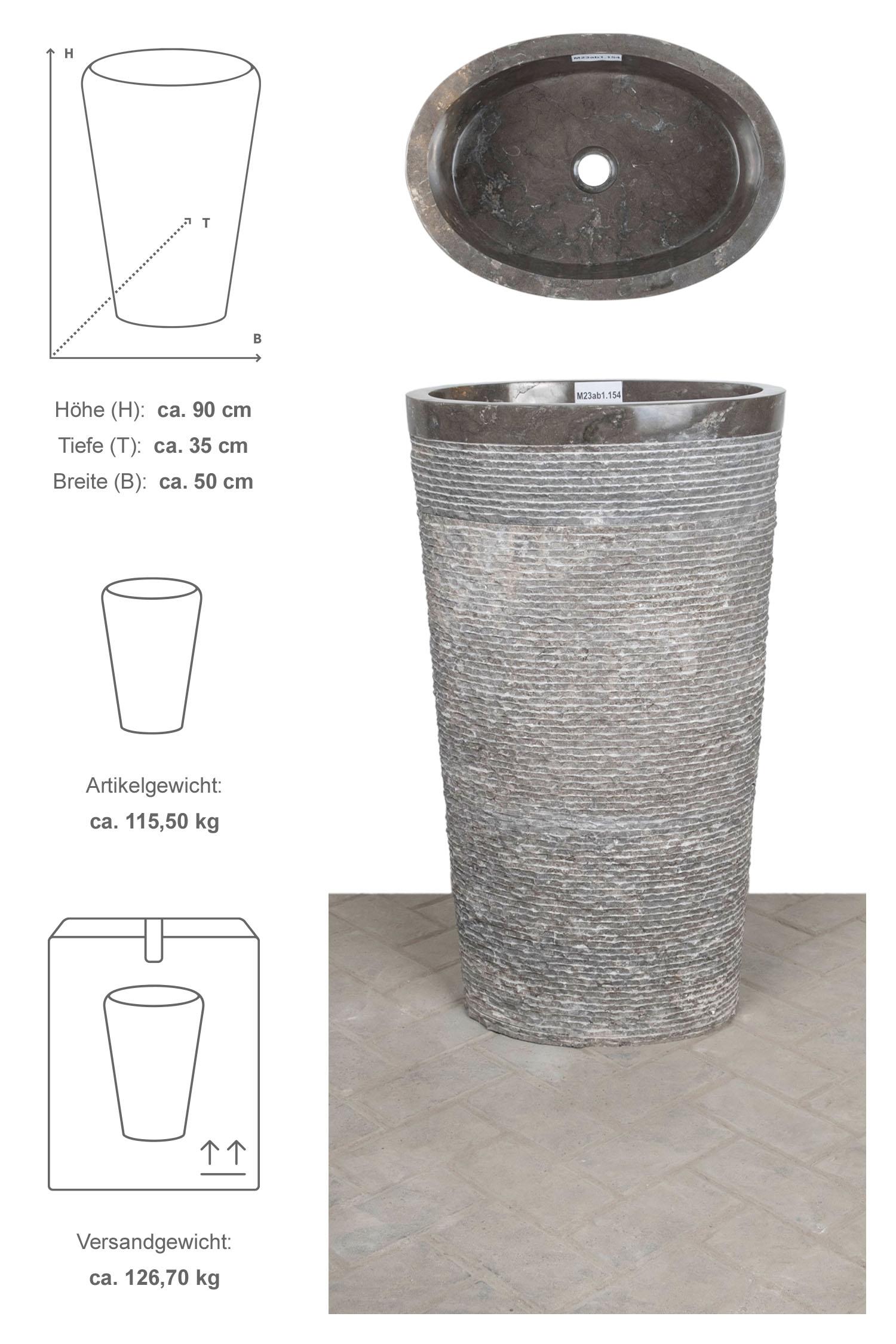 Dieses aus zwei Teilen bestehende Standwaschbecken ist wirklich eine Komplettlösung! Die beiden Teile sind genau ineinander eingepasst und durch einfaches Aufsetzen miteinander zu verbinden. Auf der Hinterseite der Waschsäule ist eine passende Ausparung für den Syphon Anschluß eingelassen. Unterschiede in Marmorierung, Schattierung und Struktur sind das Zeichen für die Individualität eines jeden Waschbeckens.