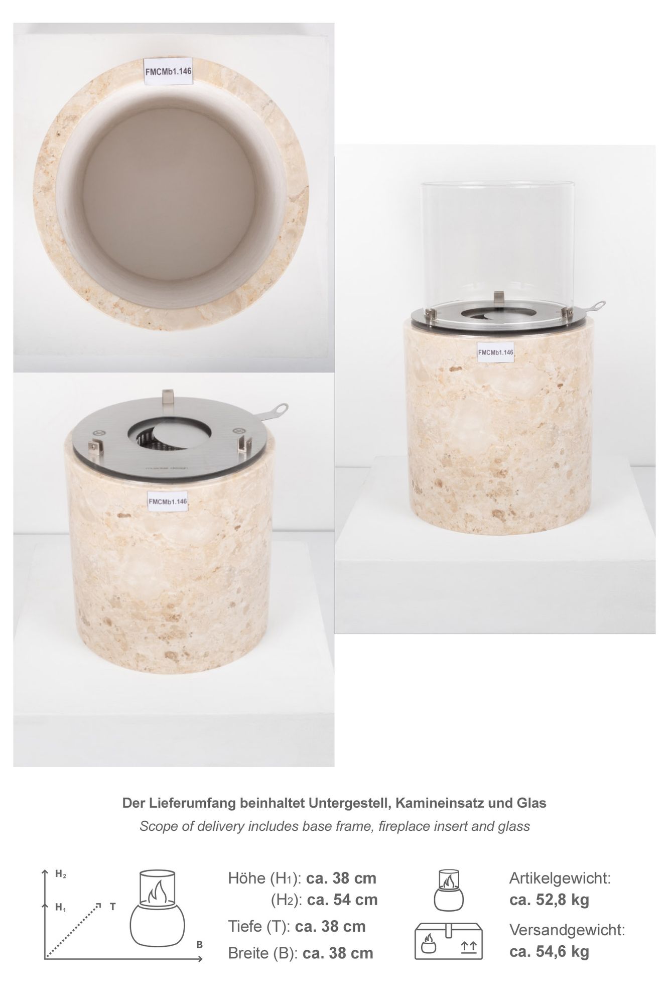 Ethanol Kamin mit Marmorsockel creme poliert Größe M