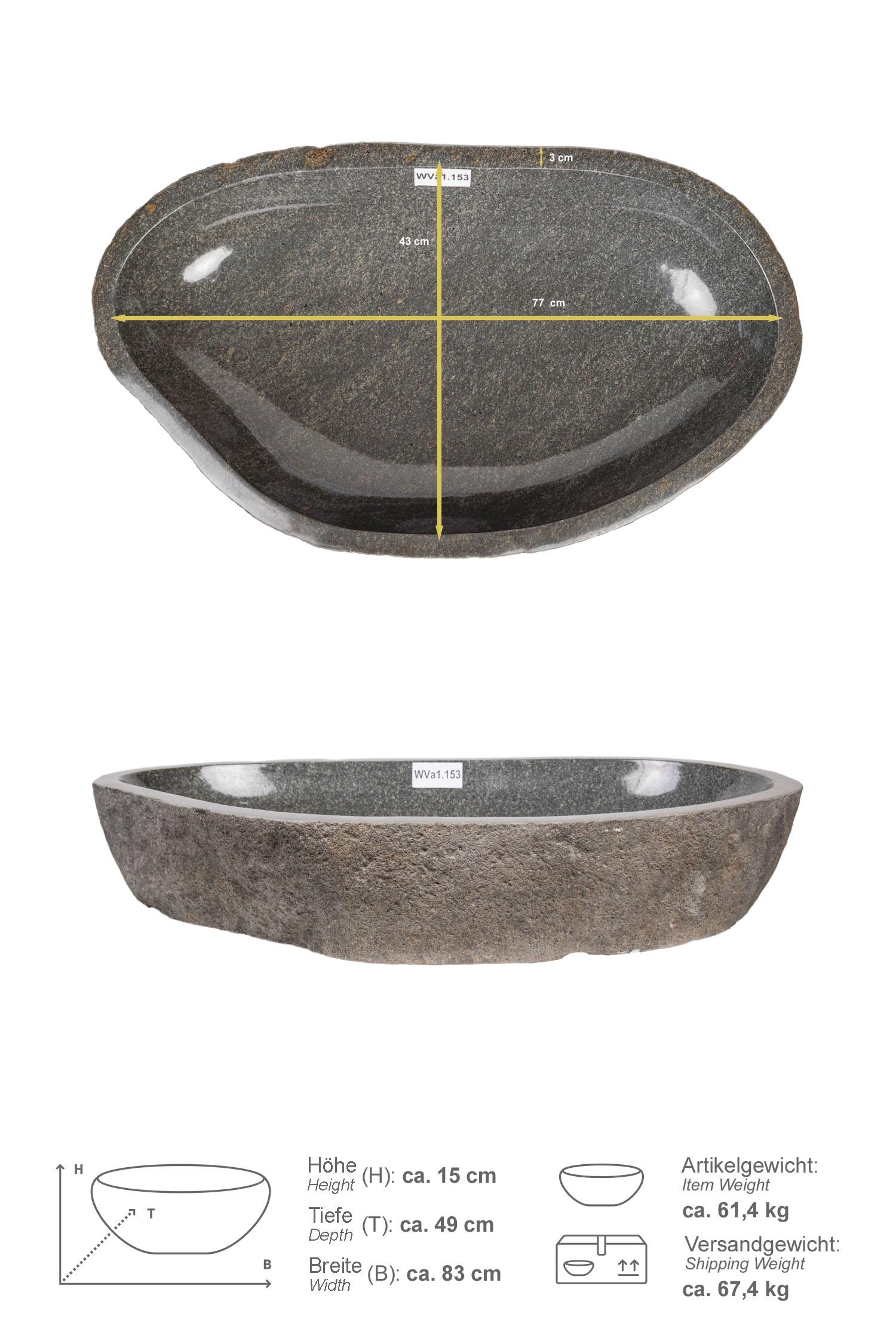 Diese ursprüngliche Schale aus Naturstein wurde in Handarbeit aus Flusssteinen javanesischer Tropenflüsse geschlagen. Der Naturstein ist besonders unempfindlich und pflegeleicht.