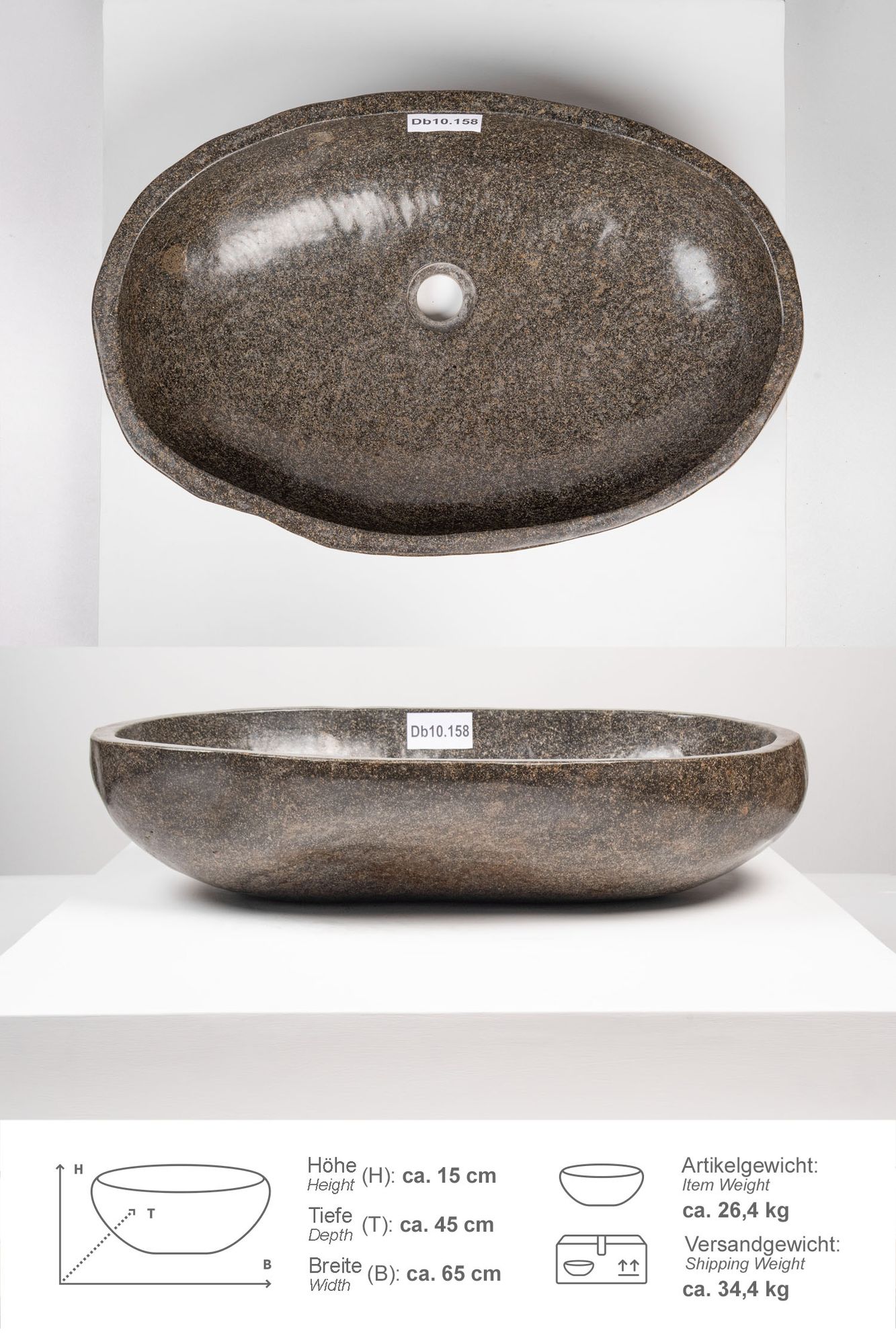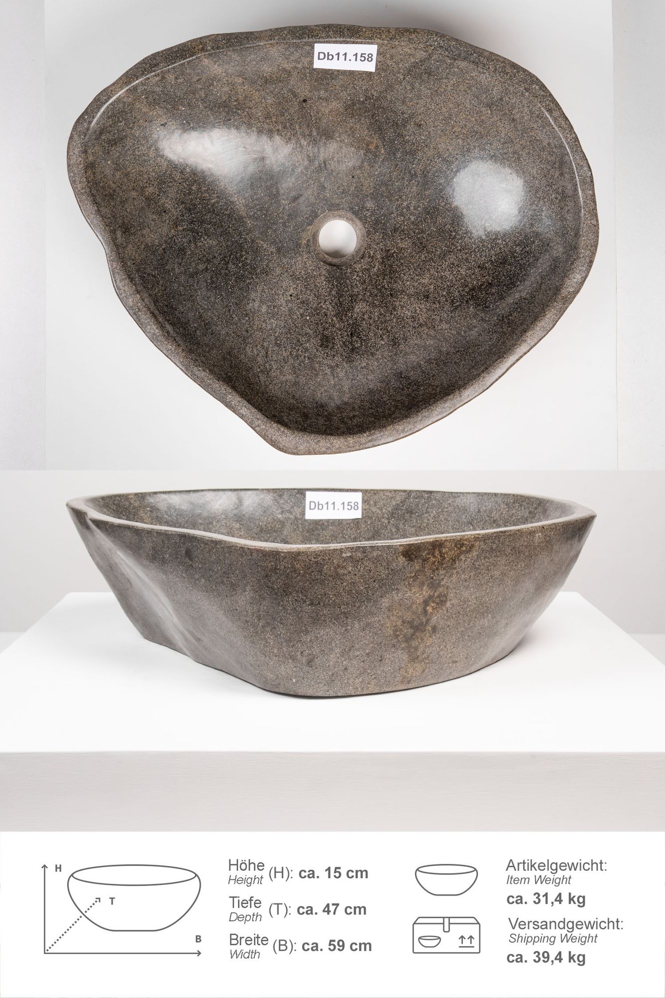 Dieses ursprüngliche Waschbecken aus Naturstein wurde aus Flusssteinen javanesischer Tropenflüsse geschlagen. Der Naturstein ist besonders unempfindlich und pflegeleicht. Das Waschbecken ist innen und außen poliert. Jeder Flussstein hat über Jahrtausende einen langen Weg durch die Tropenflüsse Indonesiens bis in Ihr Zuhause zurückgelegt. Unterschiede in der Form, Farbgebung, Schattierung und Struktur sind das Zeichen für die Individualität eines jeden Waschbeckens. Bei dem Artikelbild handelt es sich um ein Beispiel. Alle derzeit vorrätigen Waschbecken sind in der Bildergalerie (Hinweis zur Produktauswahl) mit Maßangaben abgebildet. Für weitere Fragen zum Produkt stehen wir Ihnen gerne zur Verfügung.