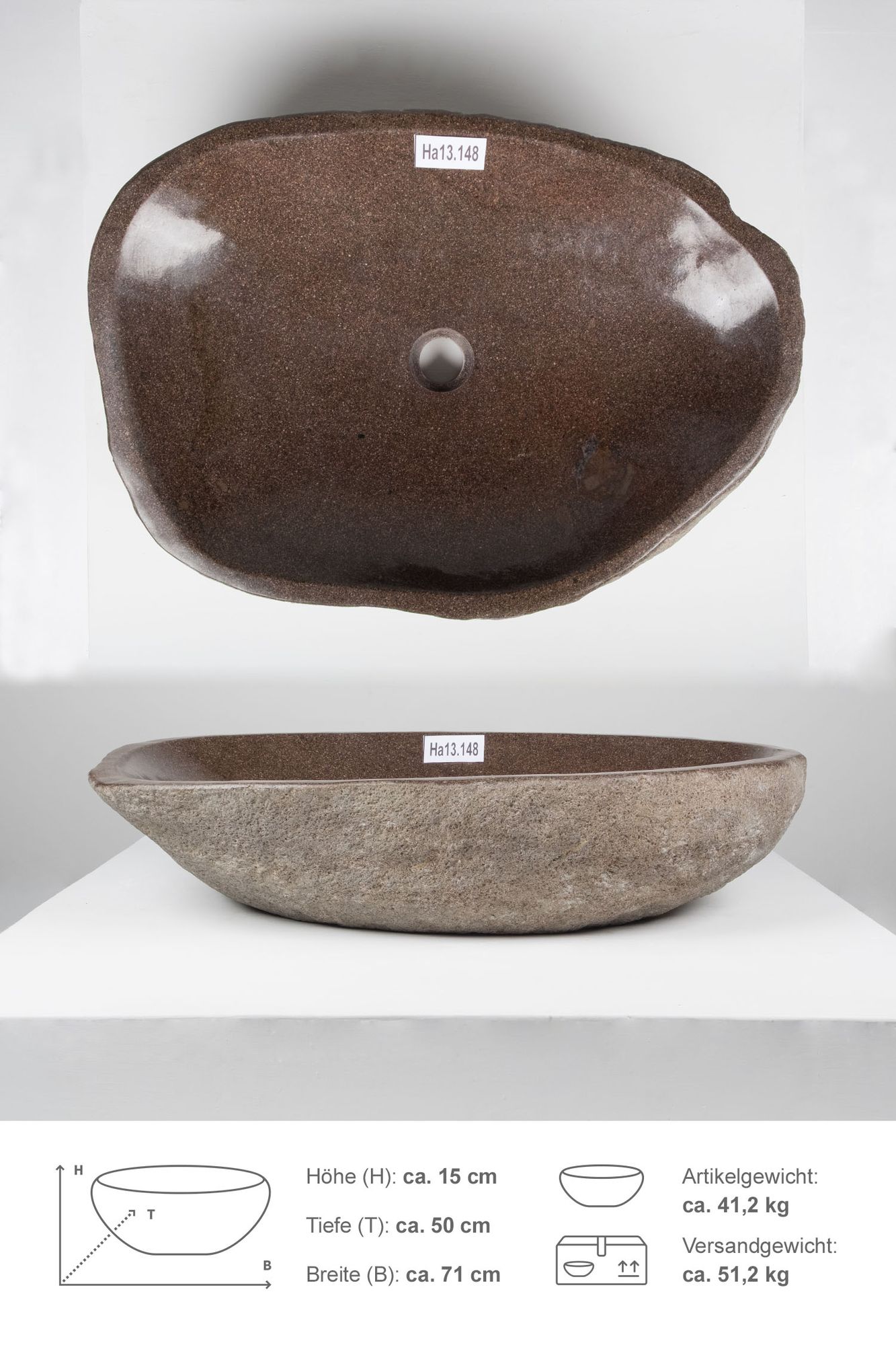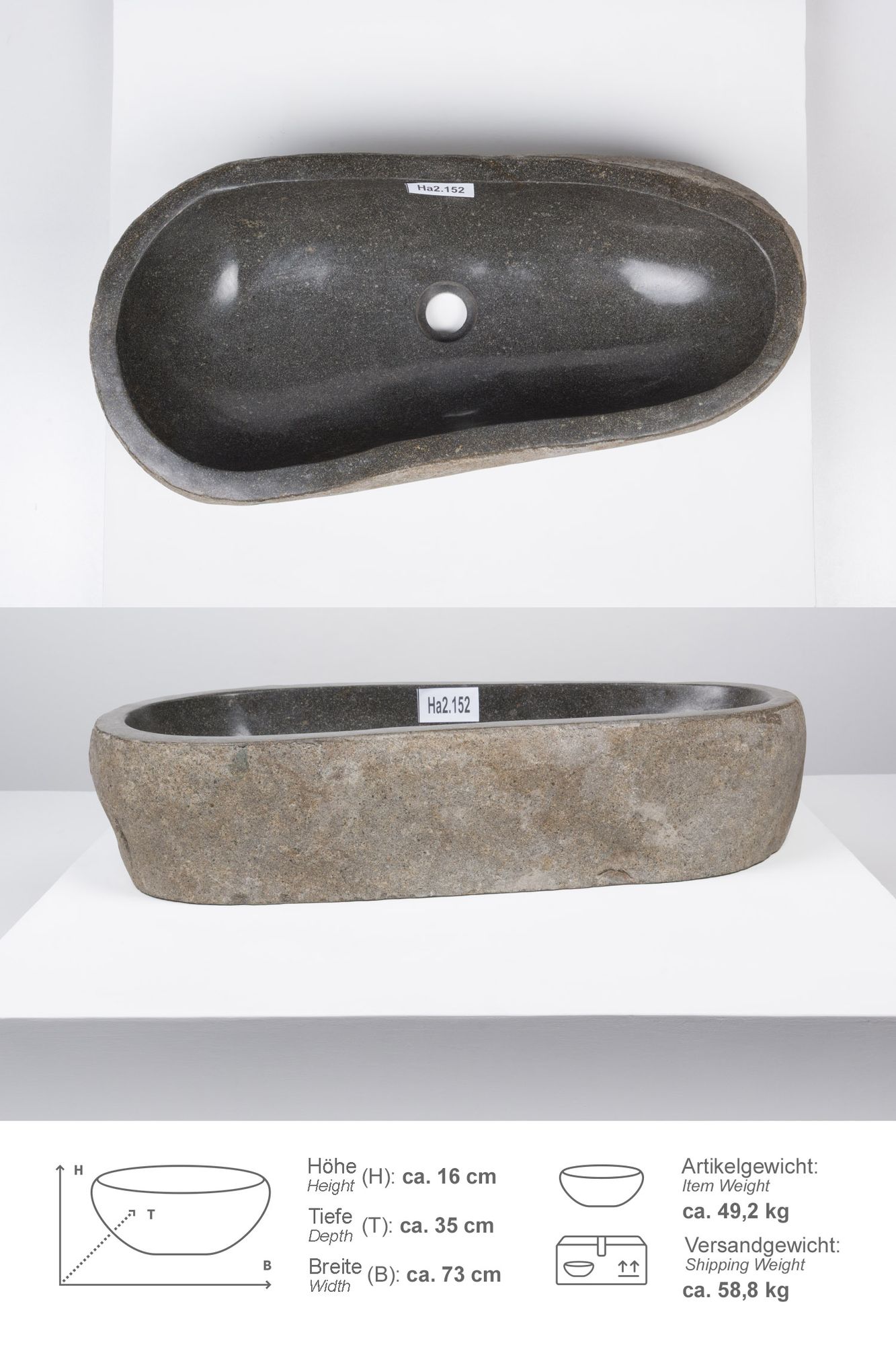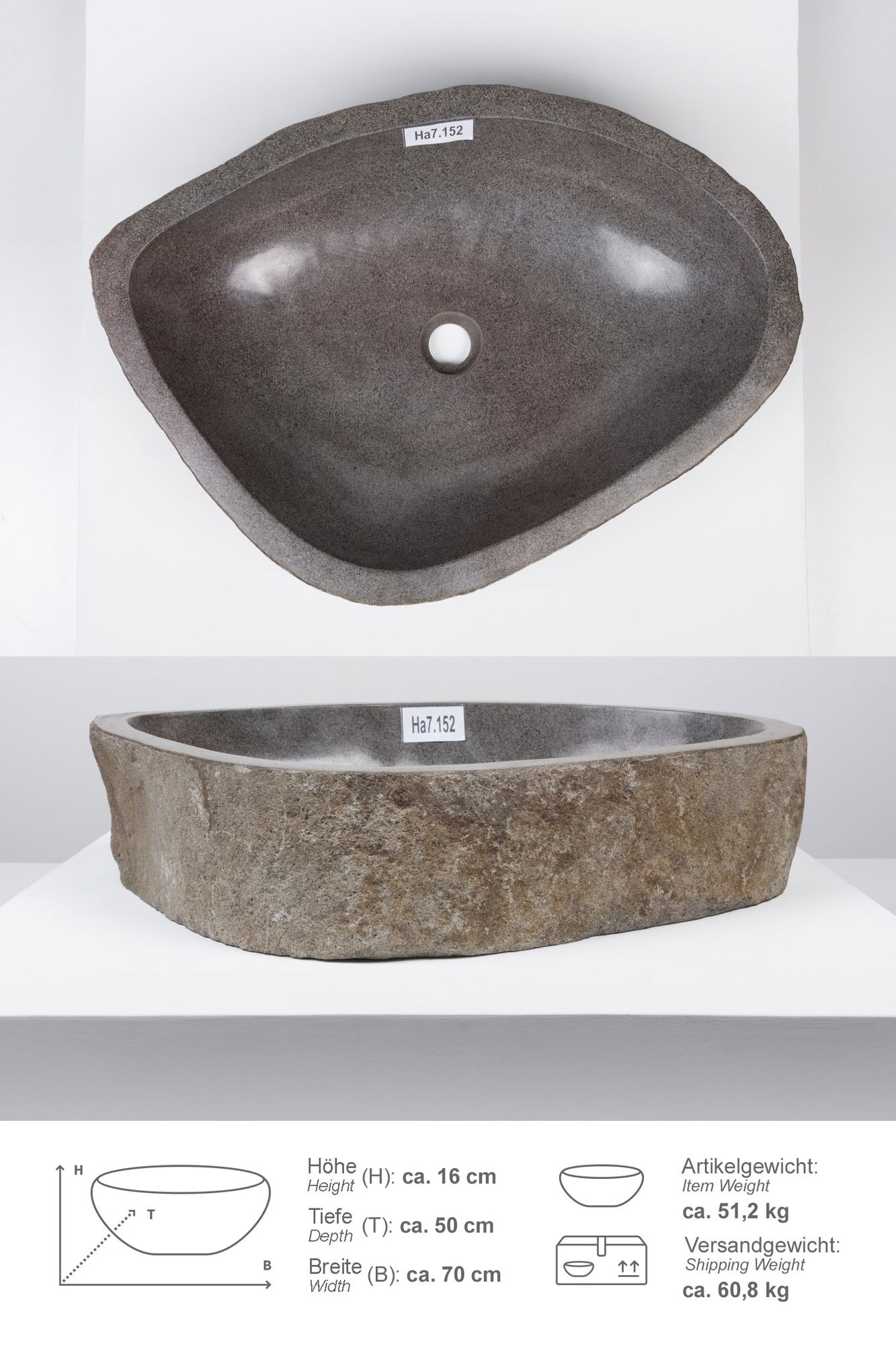 Das Waschbecken ist innen poliert und außen in der natürlichen Form des Steines naturbelassen. Jeder Flussstein hat über Jahrtausende einen langen Weg durch die Tropenflüsse Indonesiens bis in Ihr Zuhause zurückgelegt.