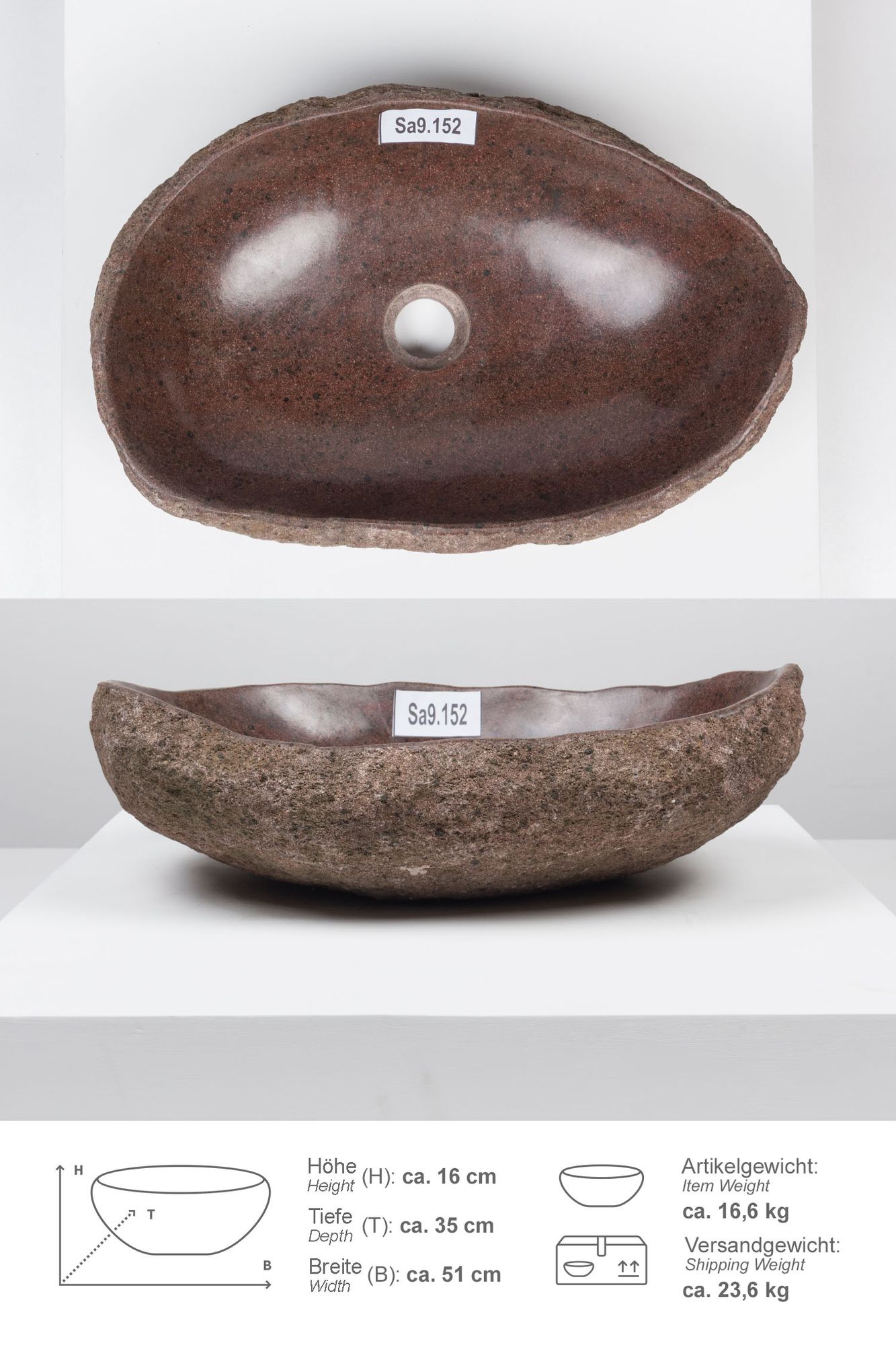 Unser Natursteinwaschbecken ist ein handgefertigtes Unikat und wird durch unsere Mitarbeiter einer strengen Qualitätskontrolle unterzogen. Dennoch ist es Naturprodukt und unterscheidet sich daher leicht in Form, Musterung und Farbe. Es kann auch bei der Größe zu leichten Abweichungen kommen, da jedes einzelne Handwaschbecken, Steinwaschbecken aus einem Kiesel bzw Findling herausgearbeitet wird. Jedes Granit Waschbecken besitzt somit seinen ganz eigenen Charme, der sich durch die individuelle Färbung, Form und Musterung ausdrückt. Flussstein Waschbecken sind immer ein tolles Highlight und verwandeln Ihr Badezimmer ganz einfach in eine asiatische Wohlfühloase. Sie verleihen ihrem Bad so ein ganz exklusives Spa Ambiente.