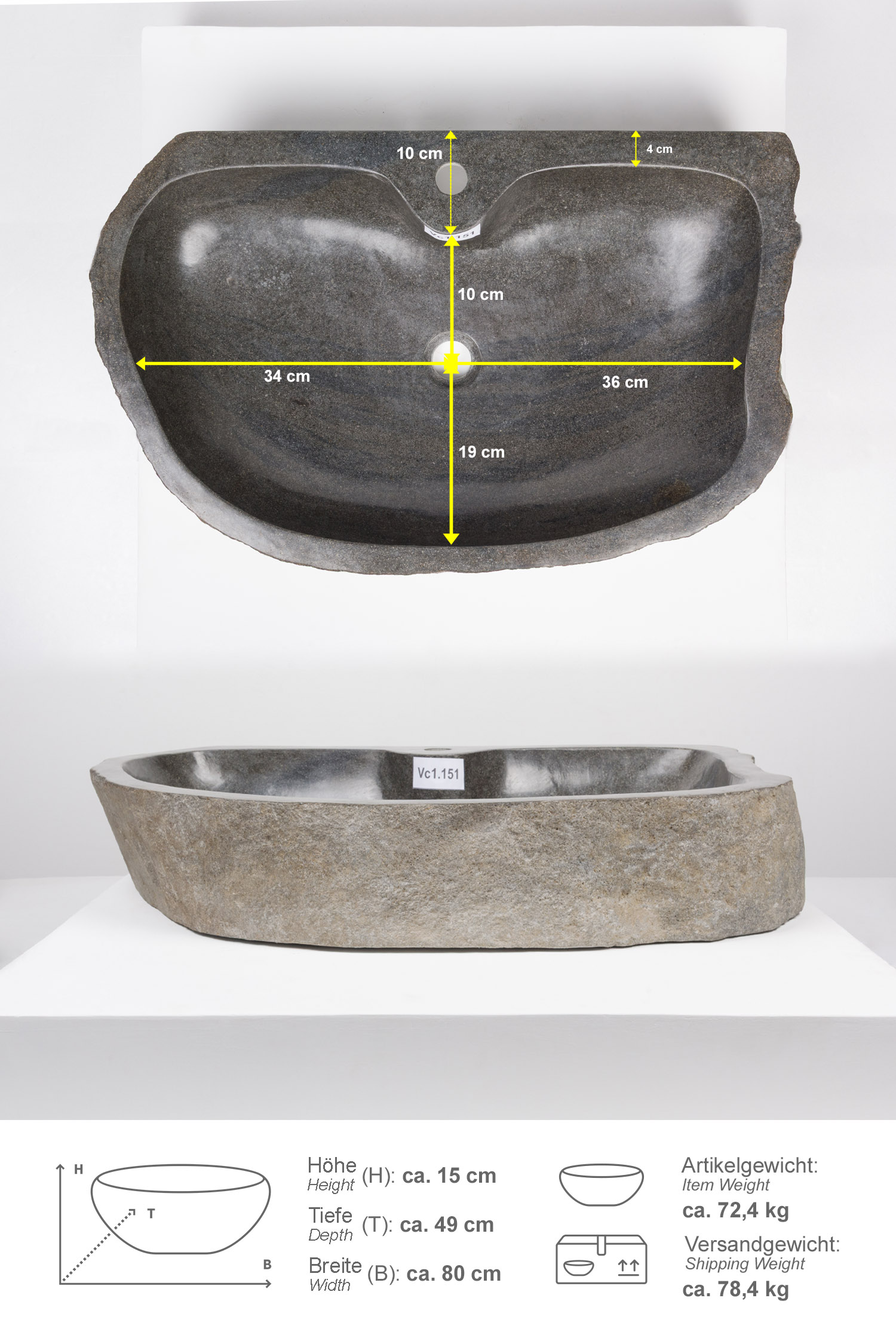 Dieses ursprüngliche Waschbecken aus Naturstein wurde aus Flusssteinen javanesischer Tropenflüsse geschlagen. Der Naturstein ist besonders unempfindlich und pflegeleicht. Das Waschbecken ist innen poliert und außen in der natürlichen Form des Steines naturbelassen. Jeder Flussstein hat über Jahrtausende einen langen Weg durch die Tropenflüsse Indonesiens bis in Ihr Zuhause zurückgelegt. Unterschiede in der Form, Farbgebung, Schattierung und Struktur sind das Zeichen für die Individualität eines jeden Waschbeckens. Bei dem Artikelbild handelt es sich um ein Beispiel. Alle derzeit vorrätigen Waschbecken sind in der Bildergalerie (Hinweis zur Produktauswahl) mit Maßangaben abgebildet. Für weitere Fragen zum Produkt stehen wir Ihnen gerne zur Verfügung.