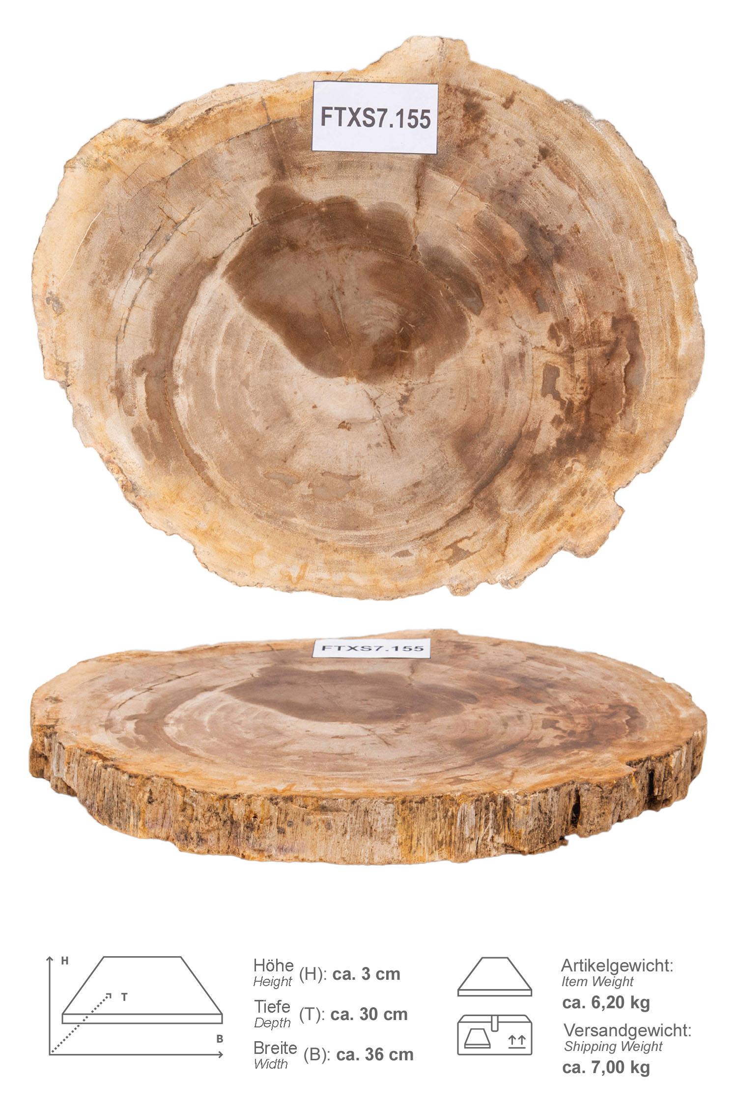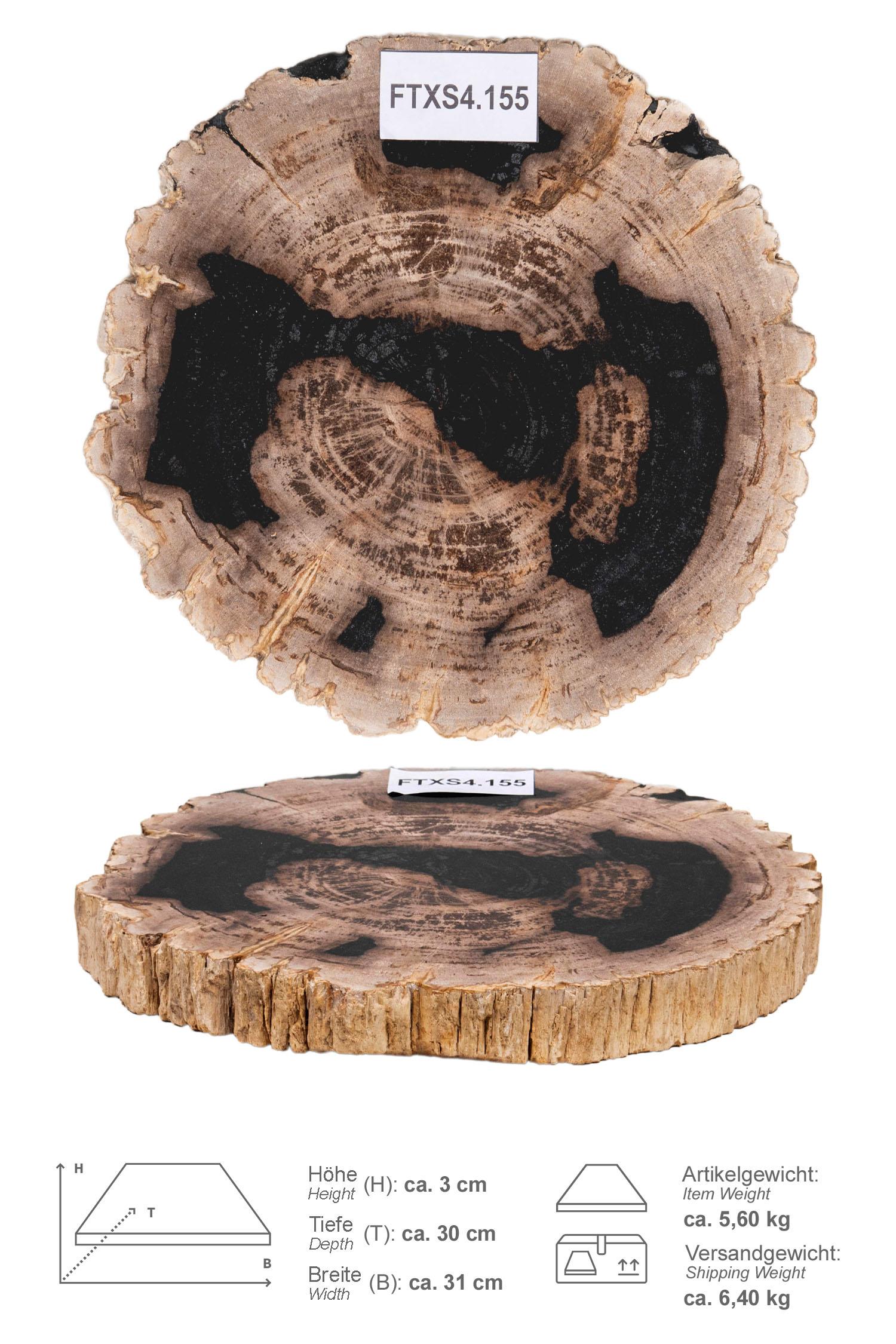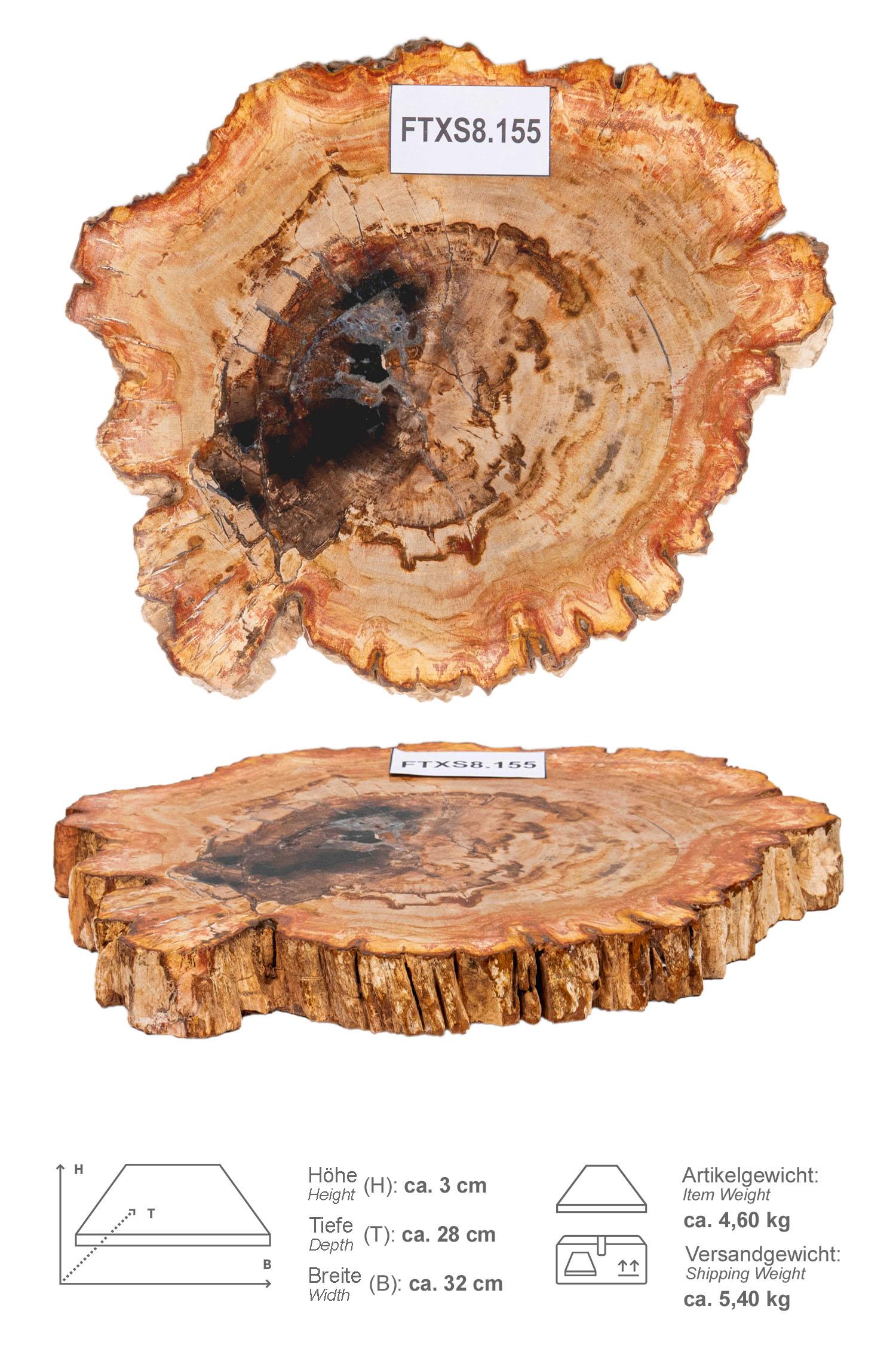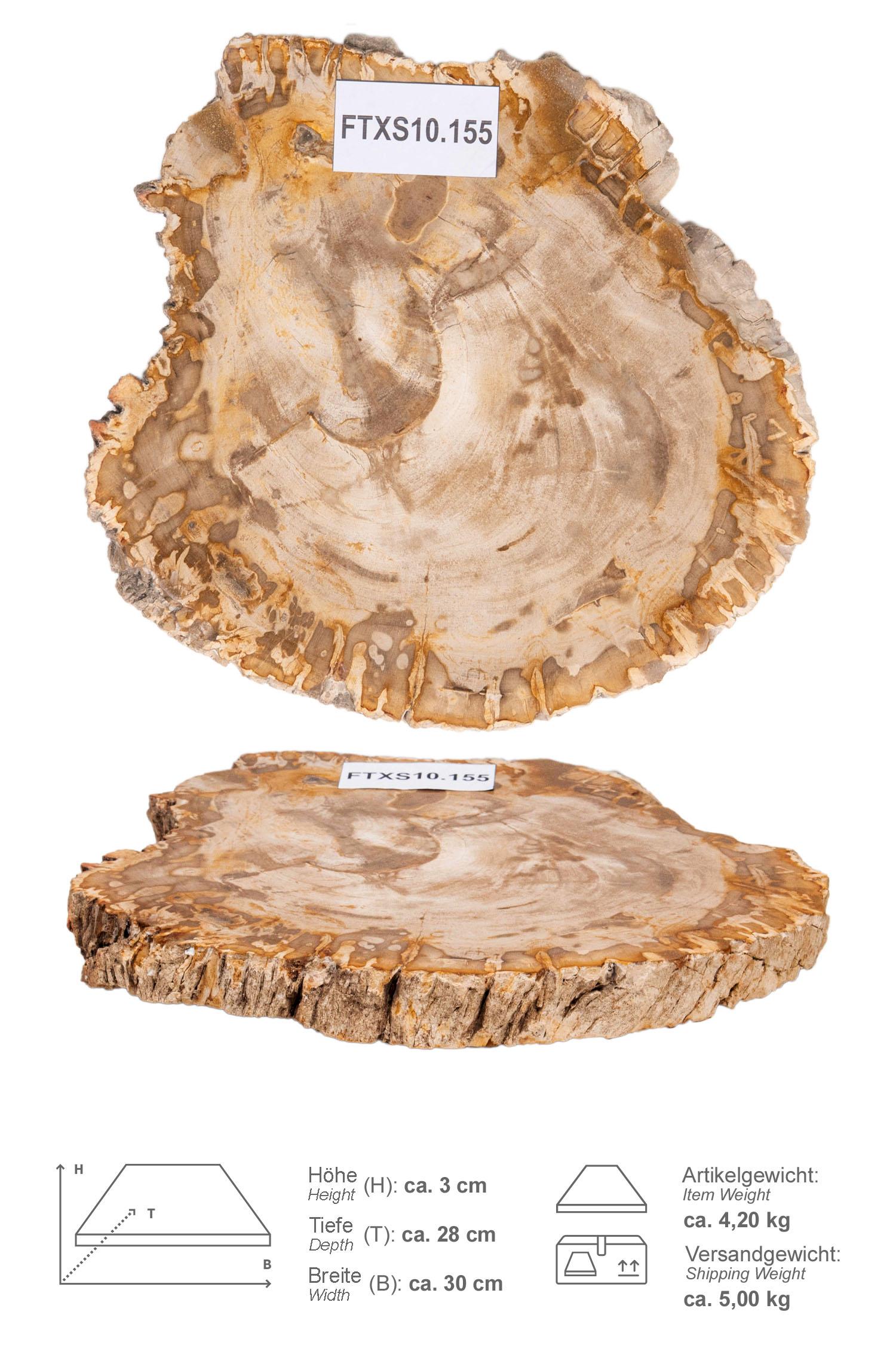 Die Scheibe wird aus einem fossilen / versteinerten Baum geschnitten und dann von Hand beidseitig poliert.