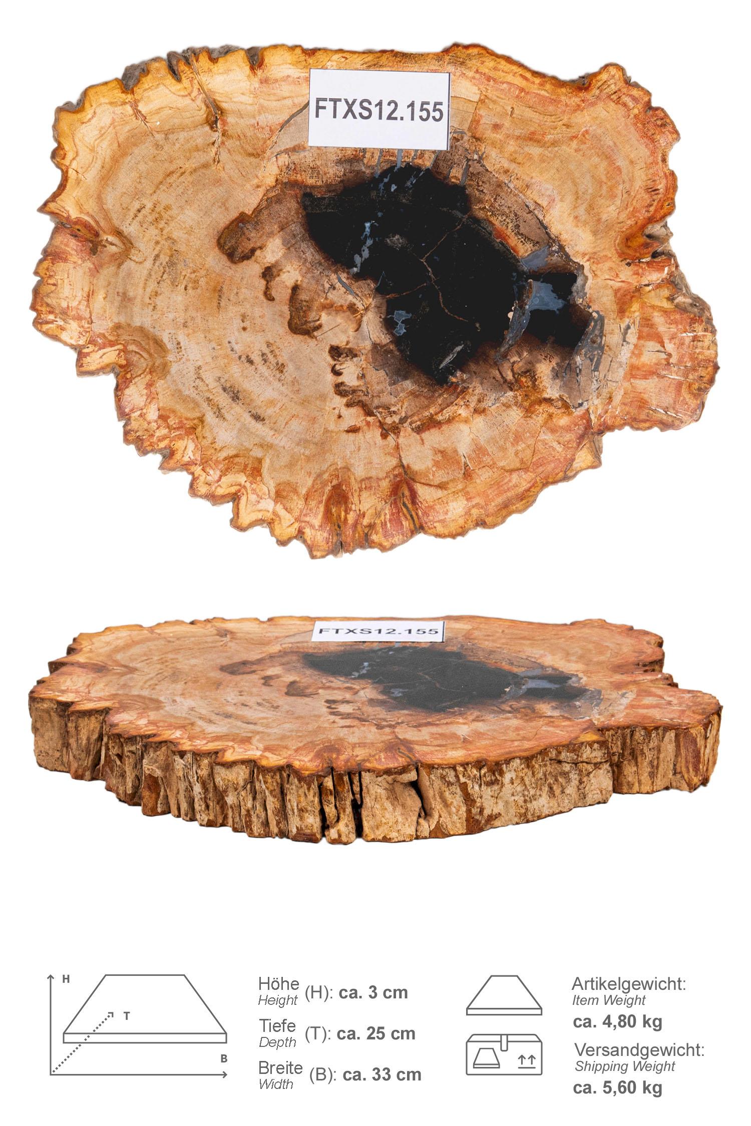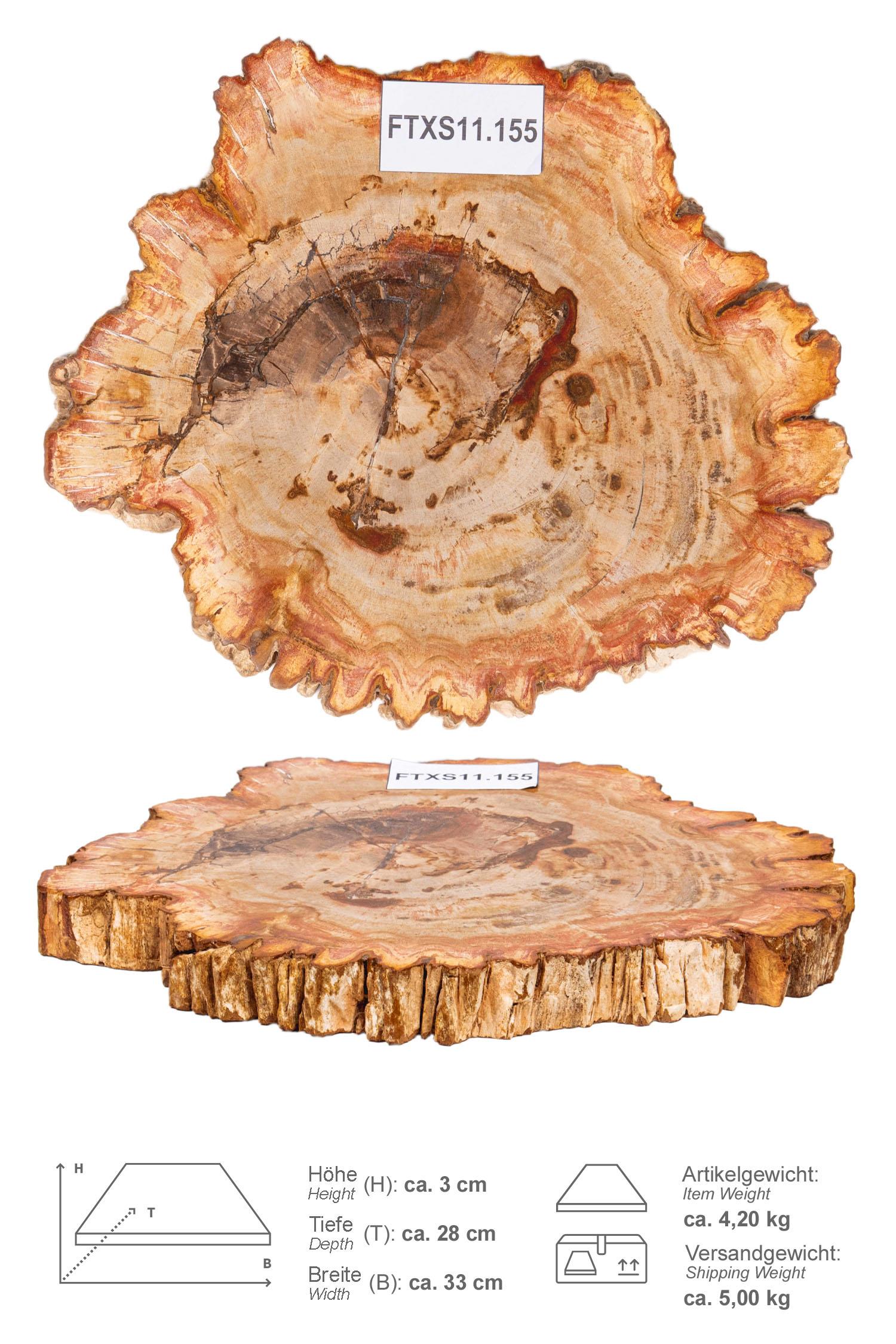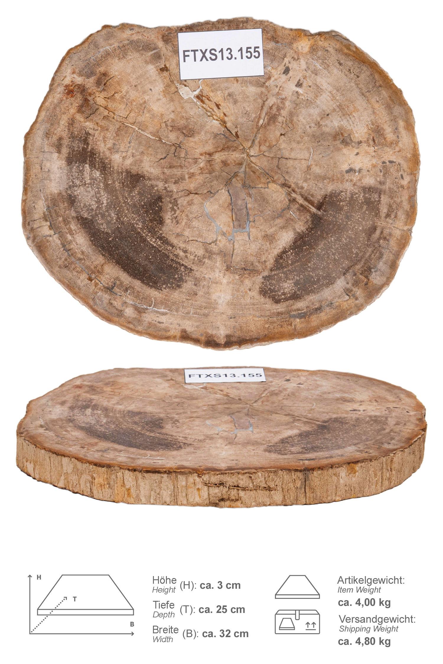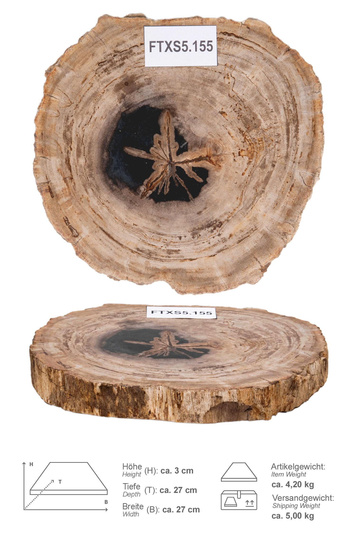 Die Scheibe wird aus einem fossilen / versteinerten Baum geschnitten und dann von Hand beidseitig poliert.