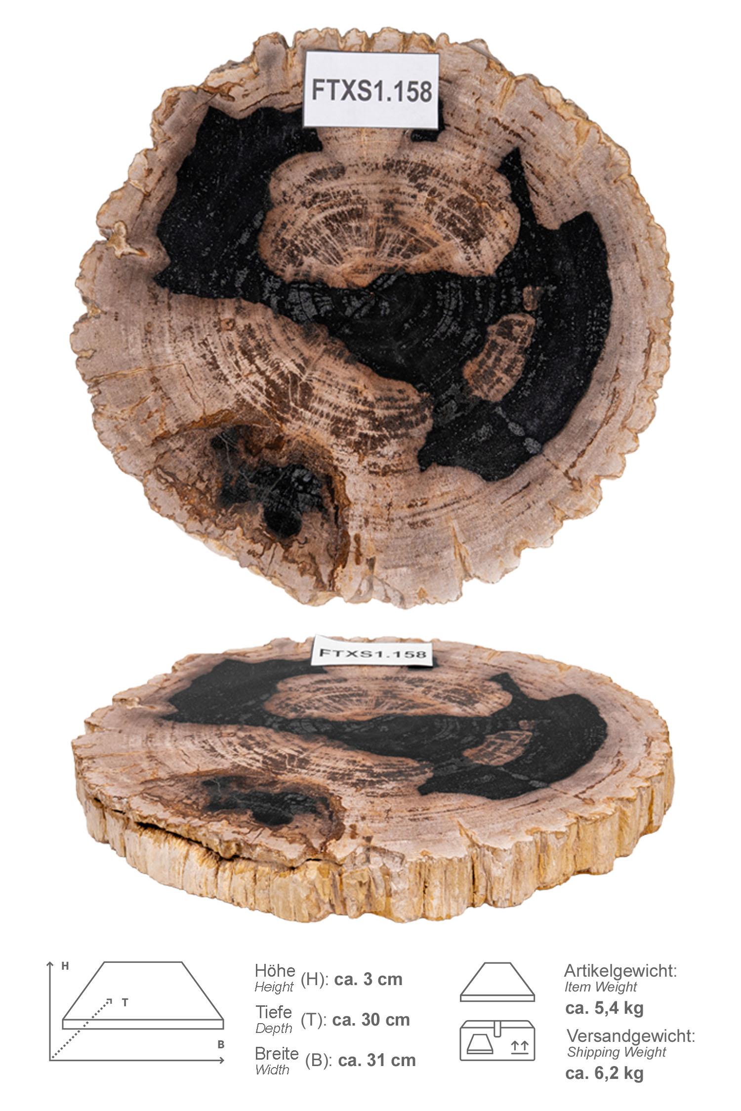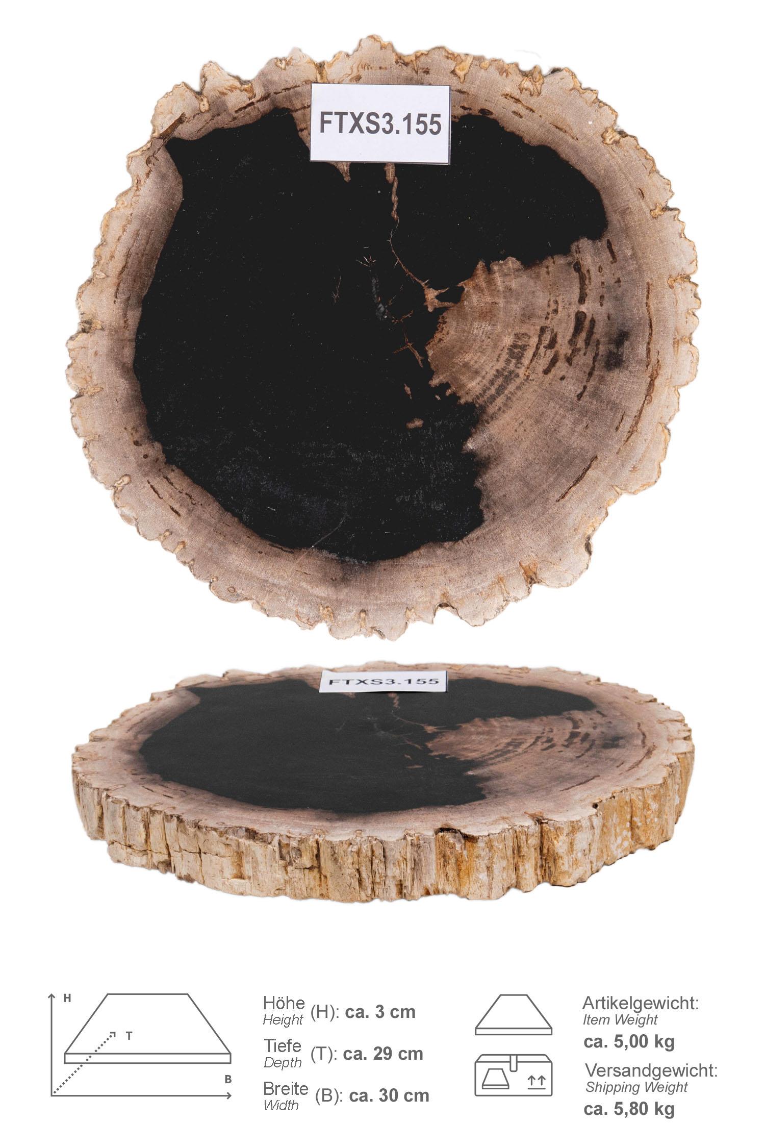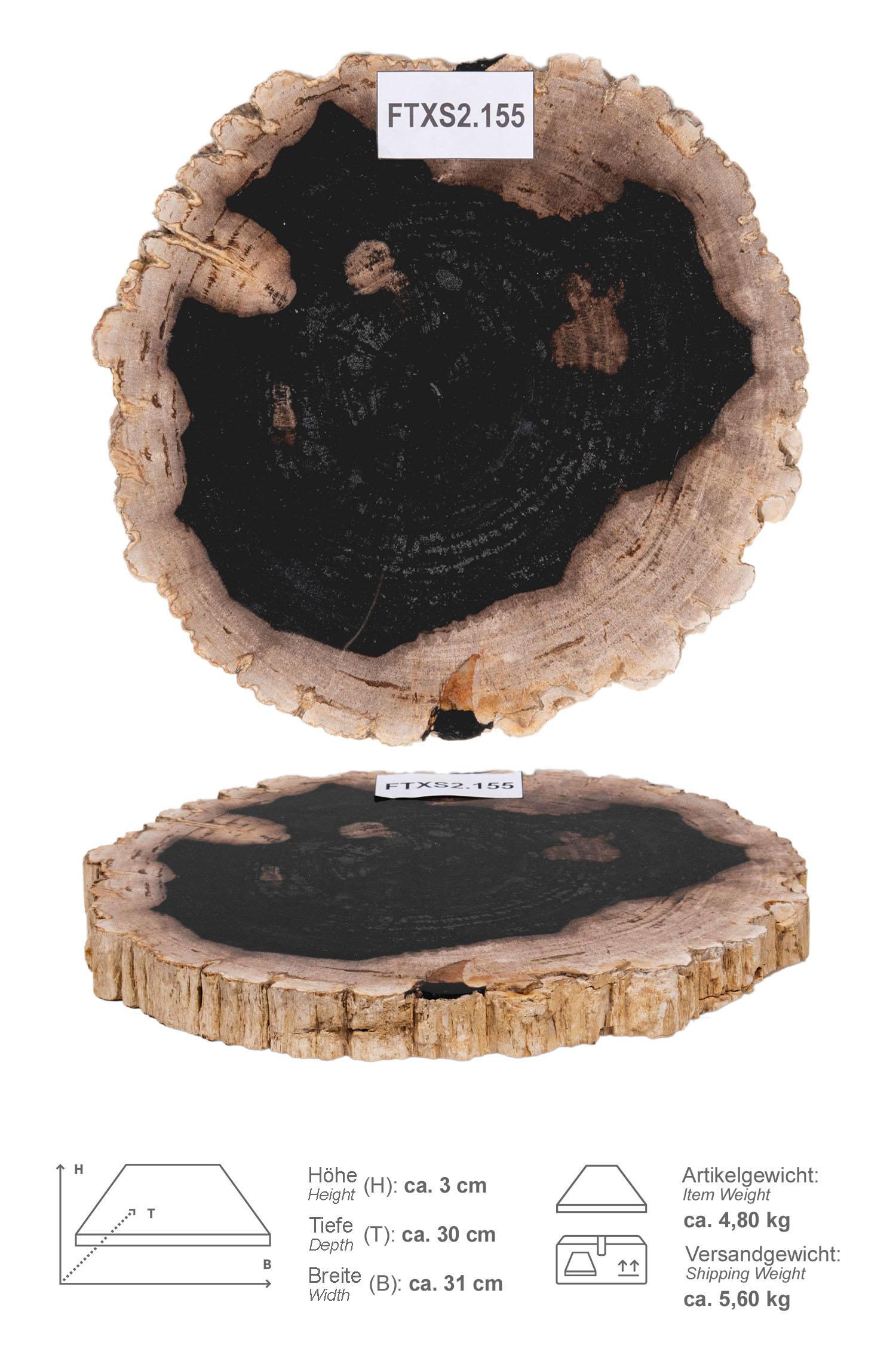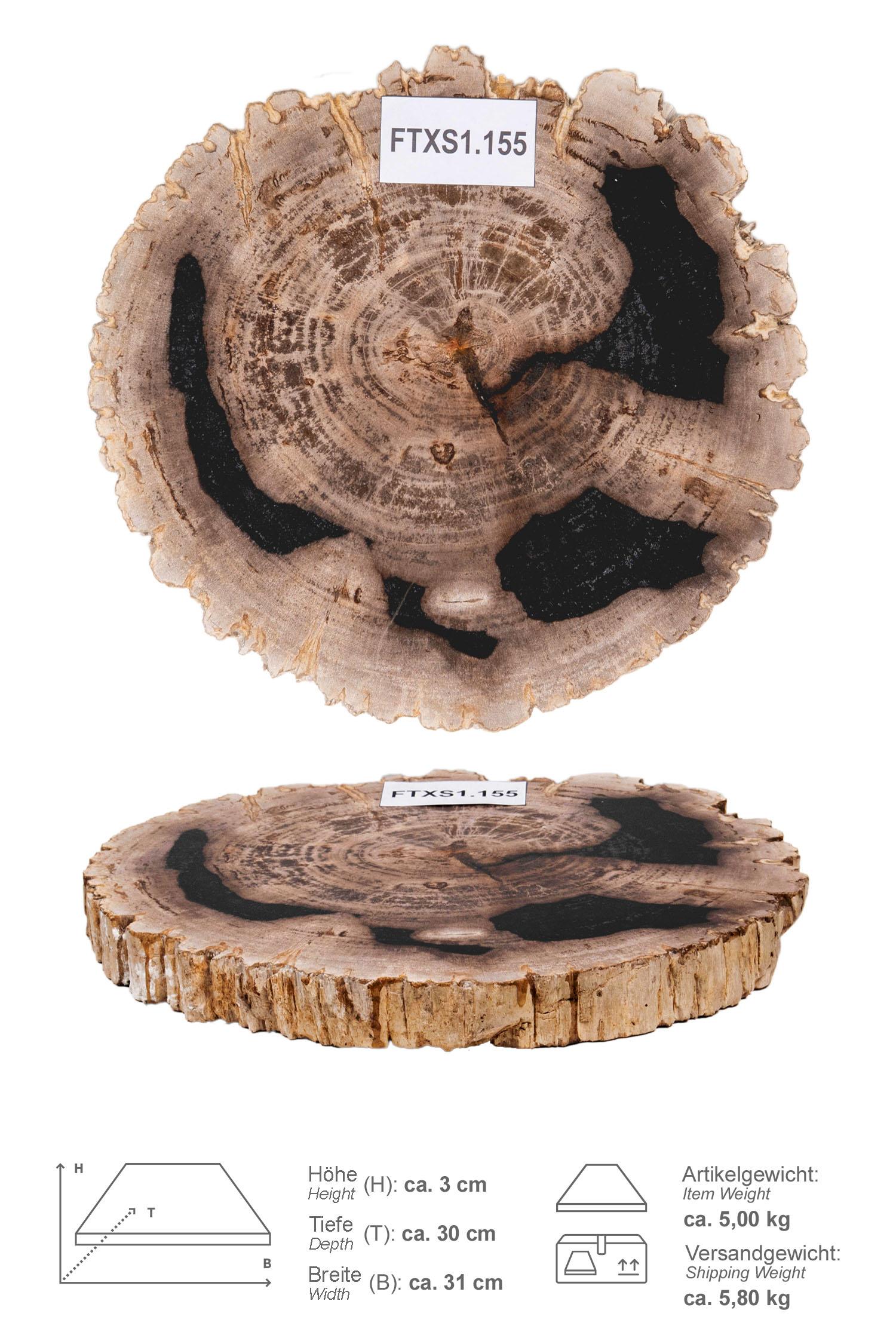 Die Scheibe wird aus einem fossilen / versteinerten Baum geschnitten und dann von Hand beidseitig poliert.