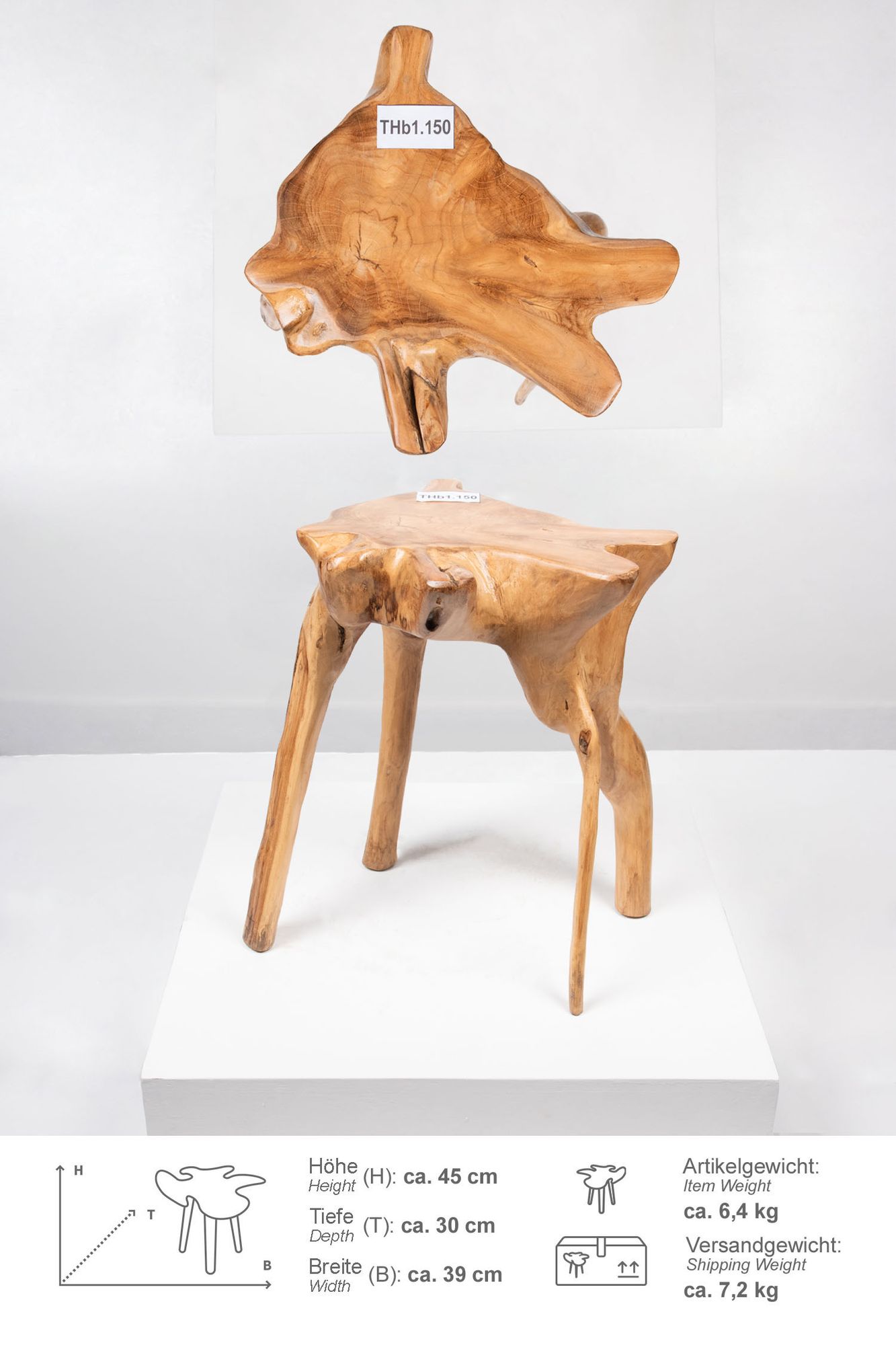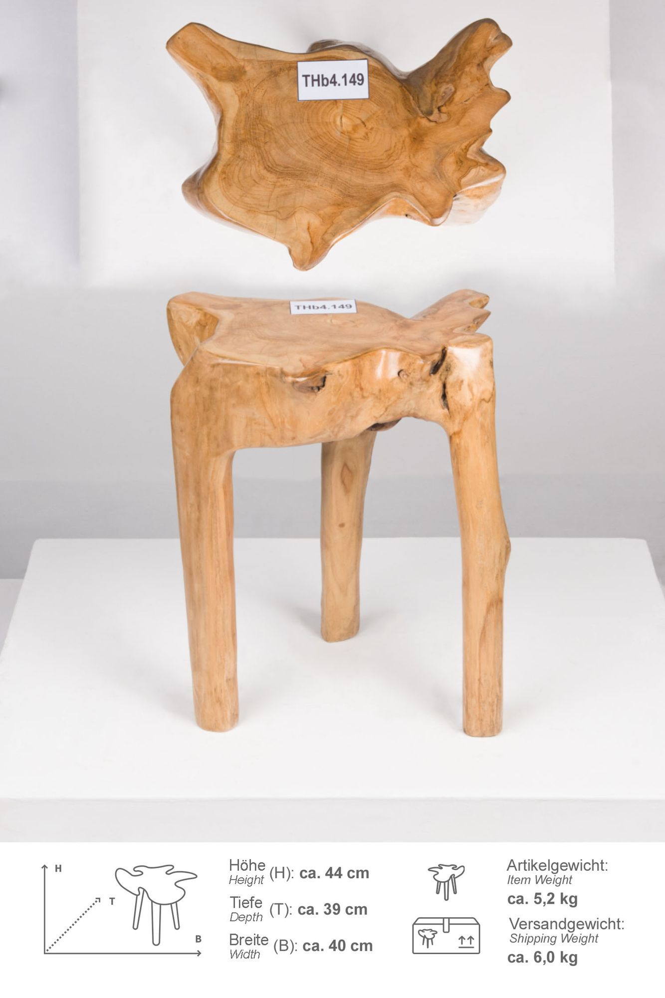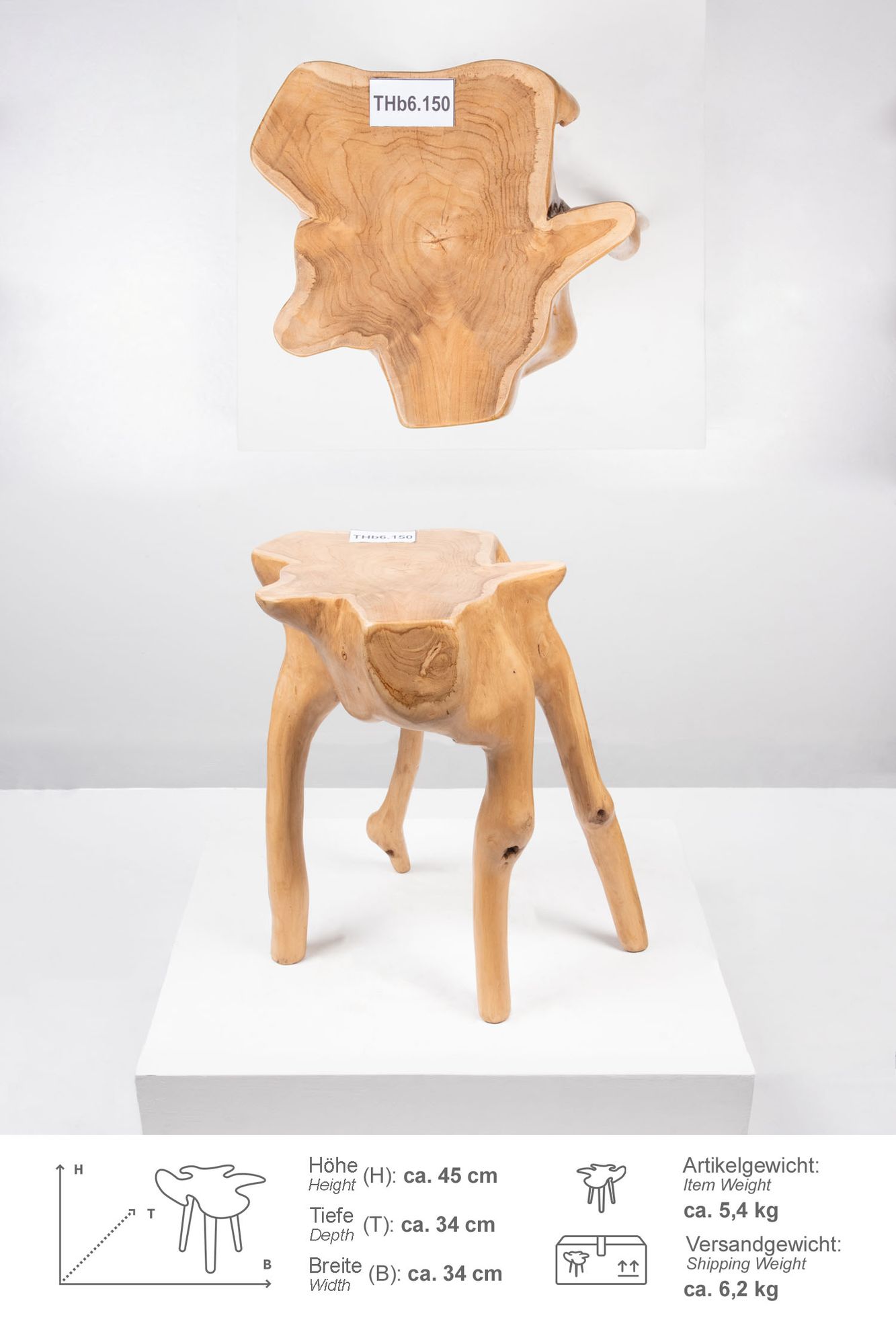 Der Hocker wird in Handarbeit aus dem Wurzelstumpf von Teakholz Bäumen gefräßt und anschließend geschliffen.
