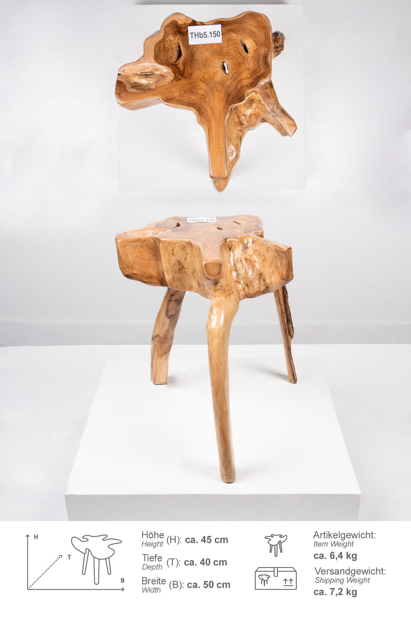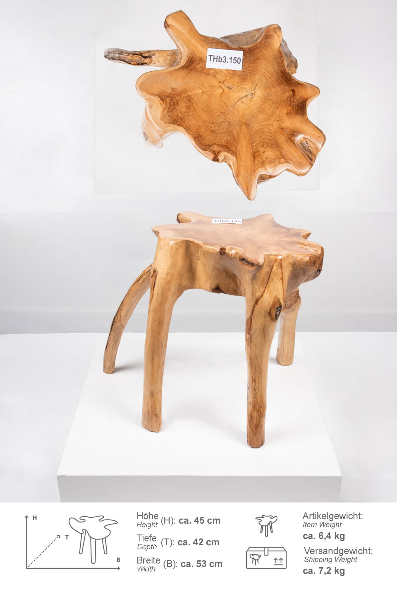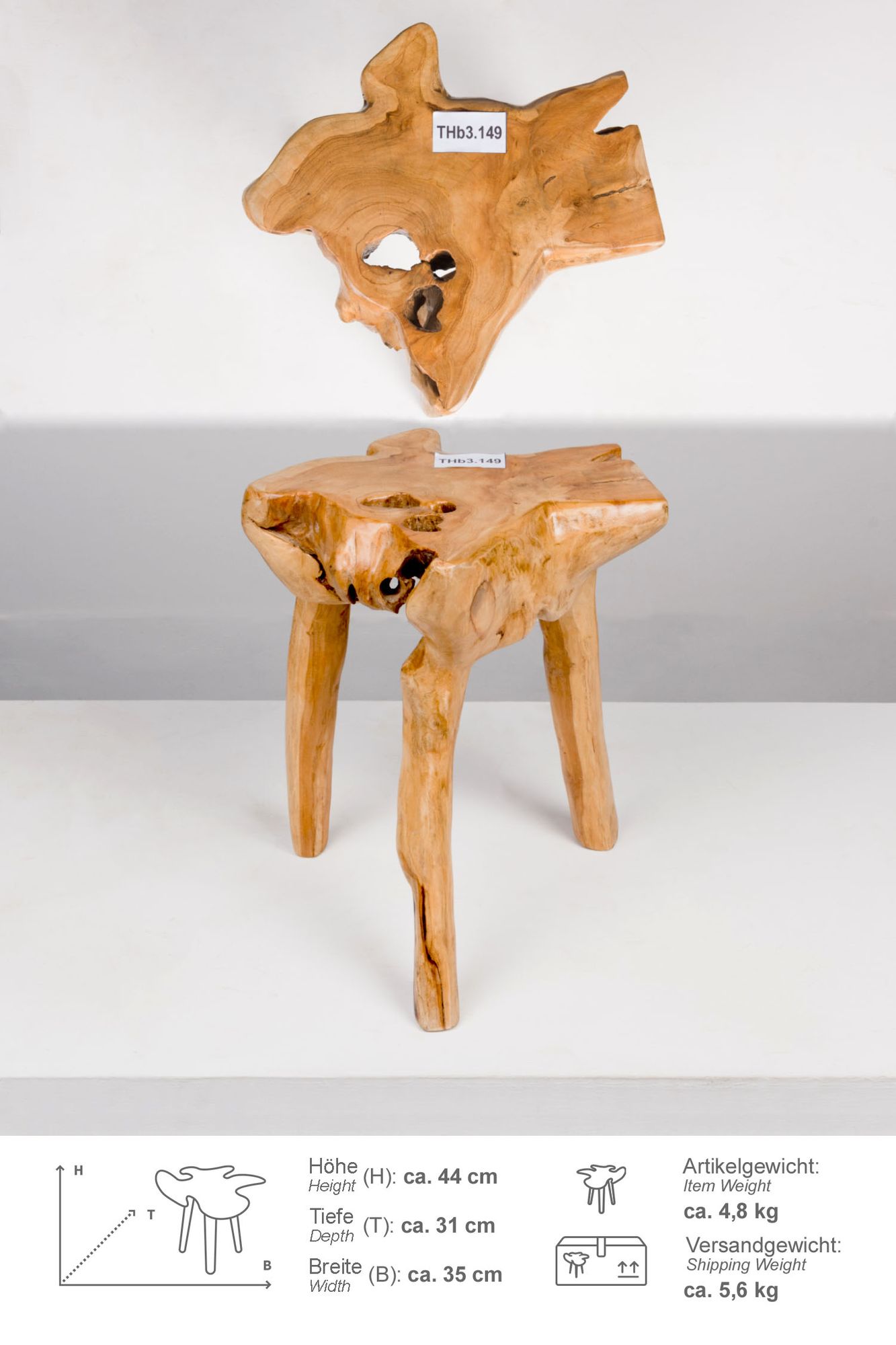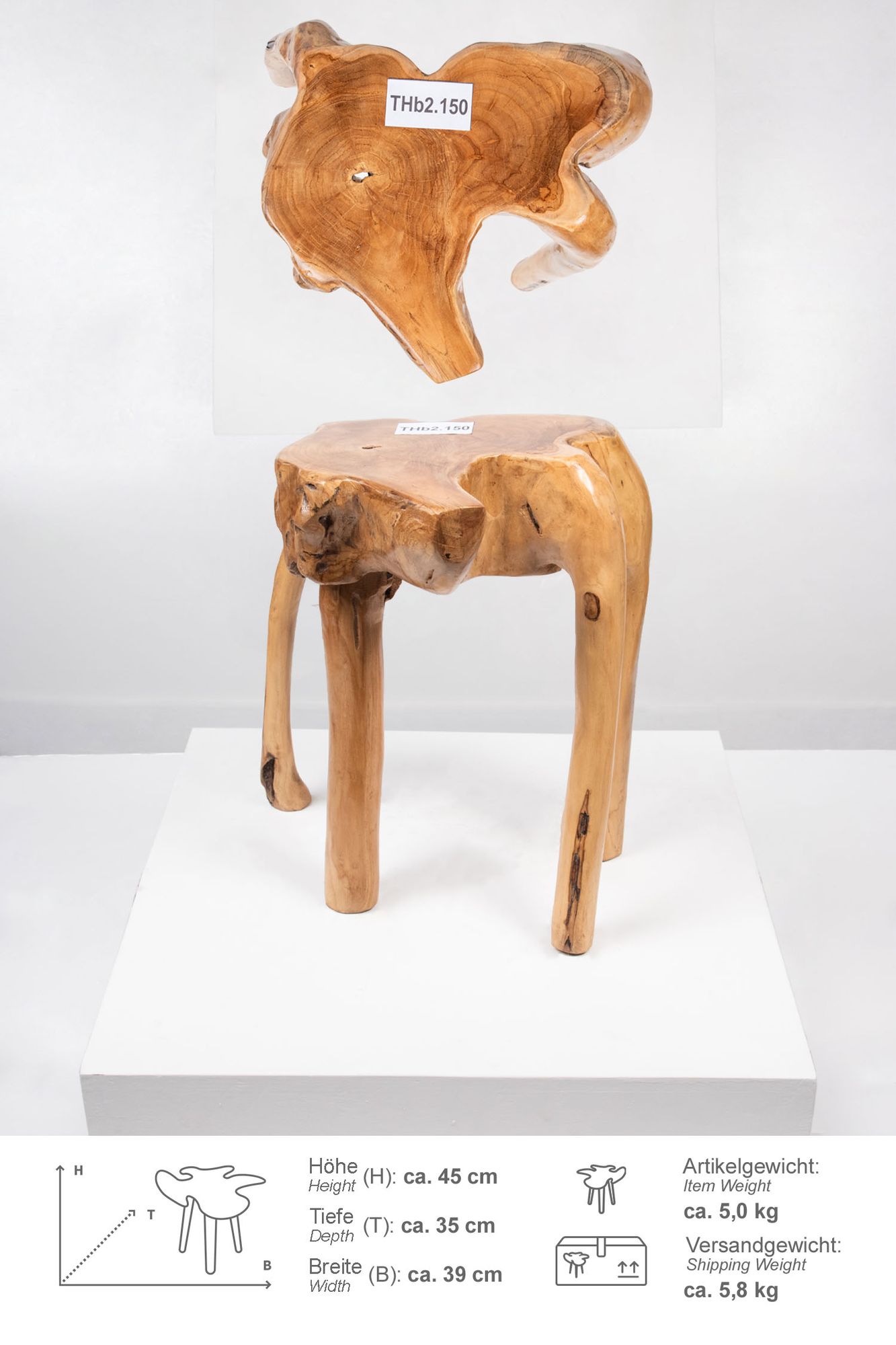Der Hocker wird in Handarbeit aus dem Wurzelstumpf von Teakholz Bäumen gefräßt und anschließend geschliffen.