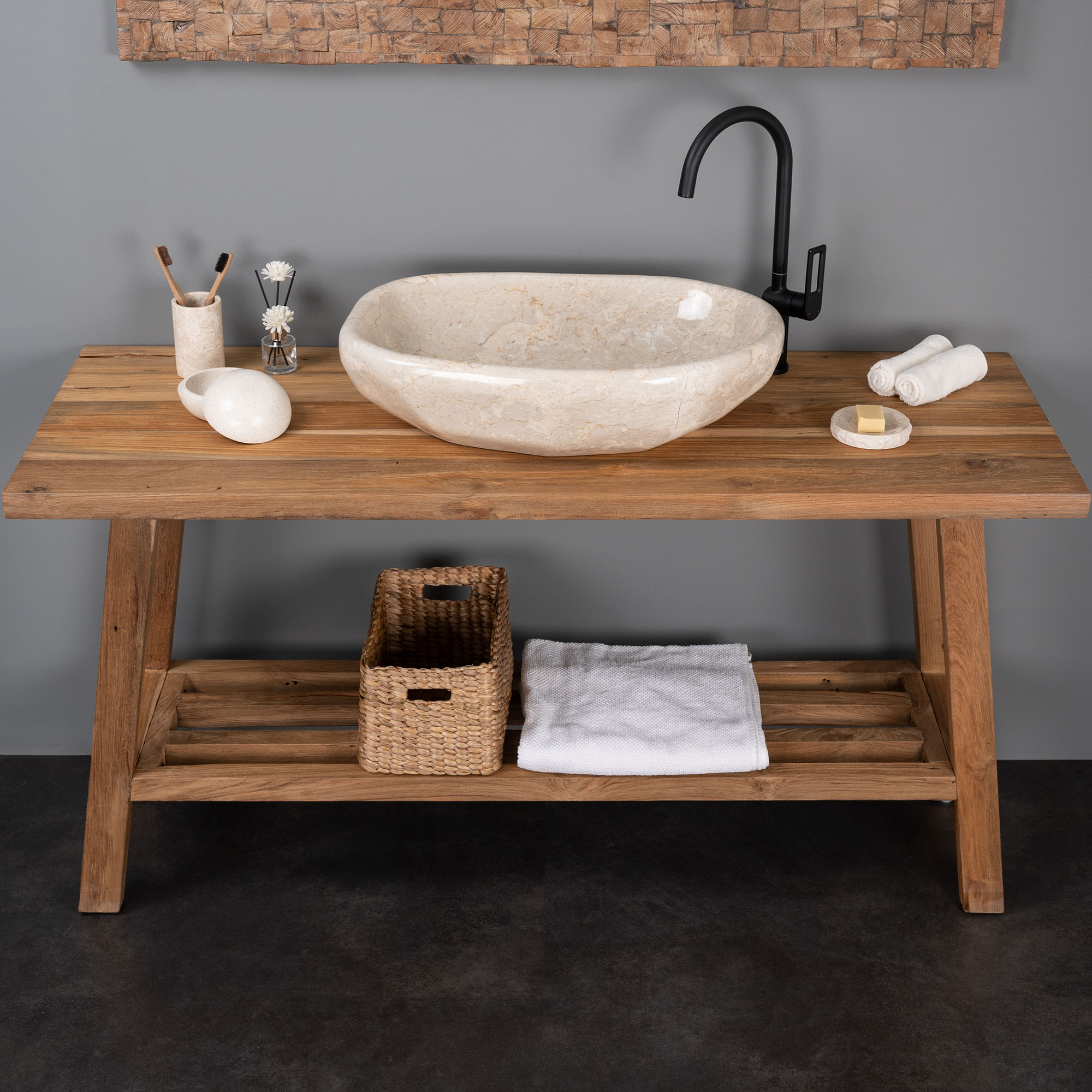 Unser stilvoller Waschtisch aus hochwertigem, recyceltem Teakholz bringt natürlichen Charme und modernes Wohnen perfekt zusammen. Jeder Unterschrank ist ein Unikat, gefertigt aus wiederverwendetem Holz mit einzigartiger Maserung. Dieser Teakholz Waschtisch bietet ein Statement für Nachhaltigkeit. Robust, langlebig und zeitlos – ideal, um Ihr Badezimmer stilvoll zu ergänzen.