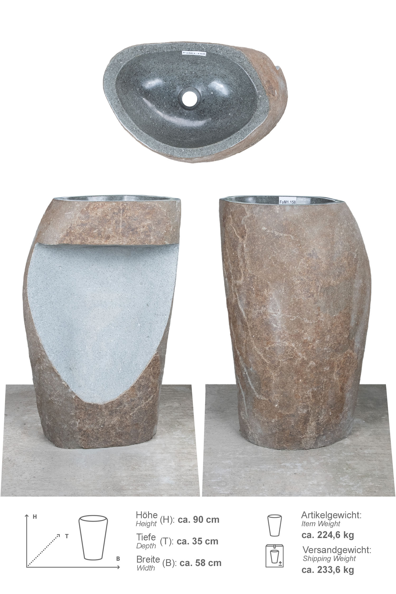 Der Stein für die Waschtisch Säule stammt ursprünglich aus den Flüssen des weltgrößten Inselstaates Indonesien. Er wurde dort mit viel Mühe geborgen und dann von Hand bearbeitet. Um ein rundum perfektes Gesamtbild zu erhalten, wurden abschließend die liebevollen Details der Säule ausgearbeitet. Somit ist jedes unserer Waschbecken ein einmaliges Unikat. Die Farbgebung, Schattierung sowie Struktur und Form der Säule kann daher vom Artikelbild abweichen. In unserer Bildergalerie unter dem Punkt „Unikate anzeigen und Produkt-Code auswählen“, können Sie sich Ihren persönlichen Favoriten, IHR EINZELSTÜCK aussuchen. Gerne helfen wir Ihnen hierbei auch telefonisch weiter.