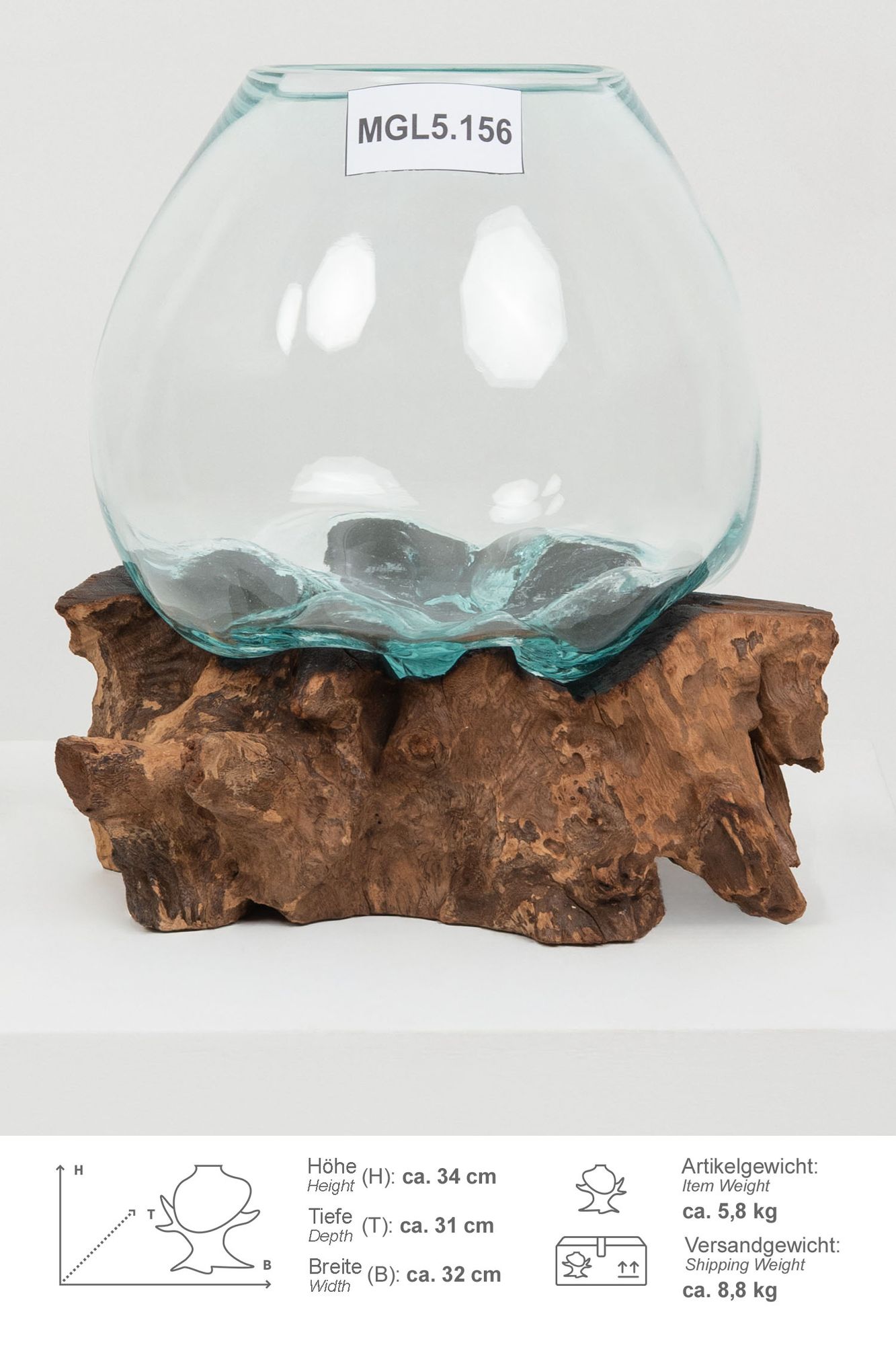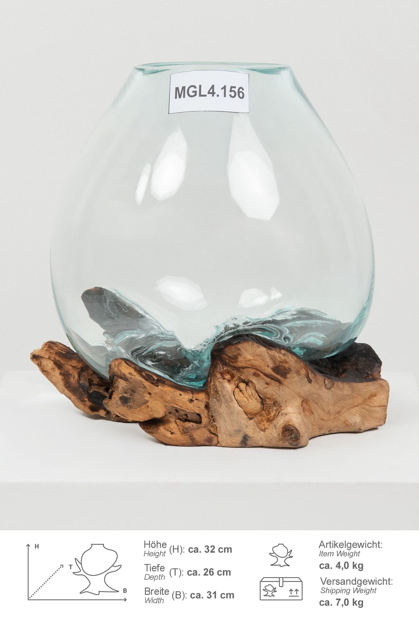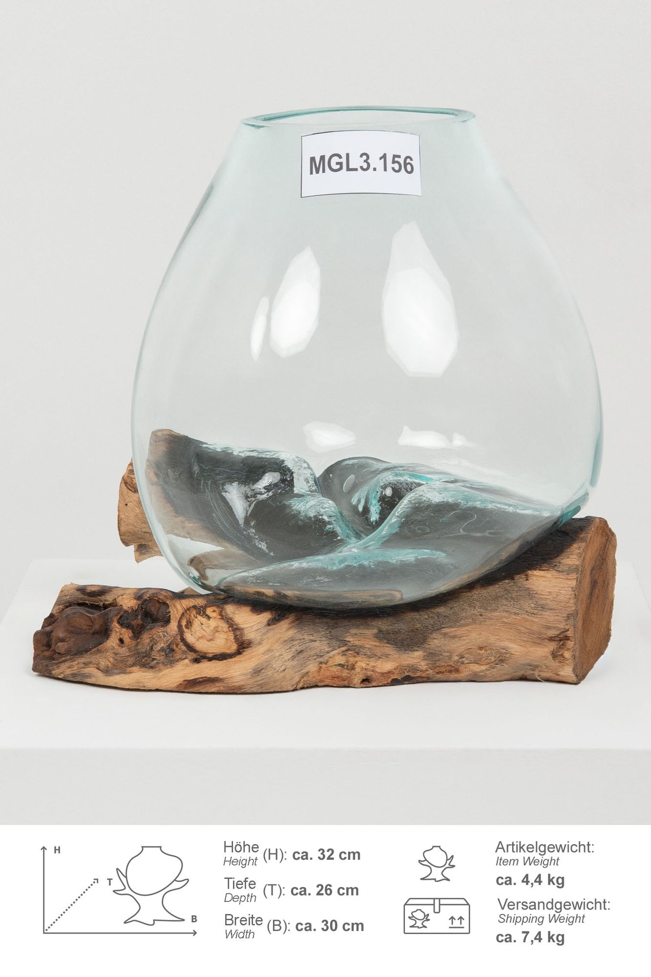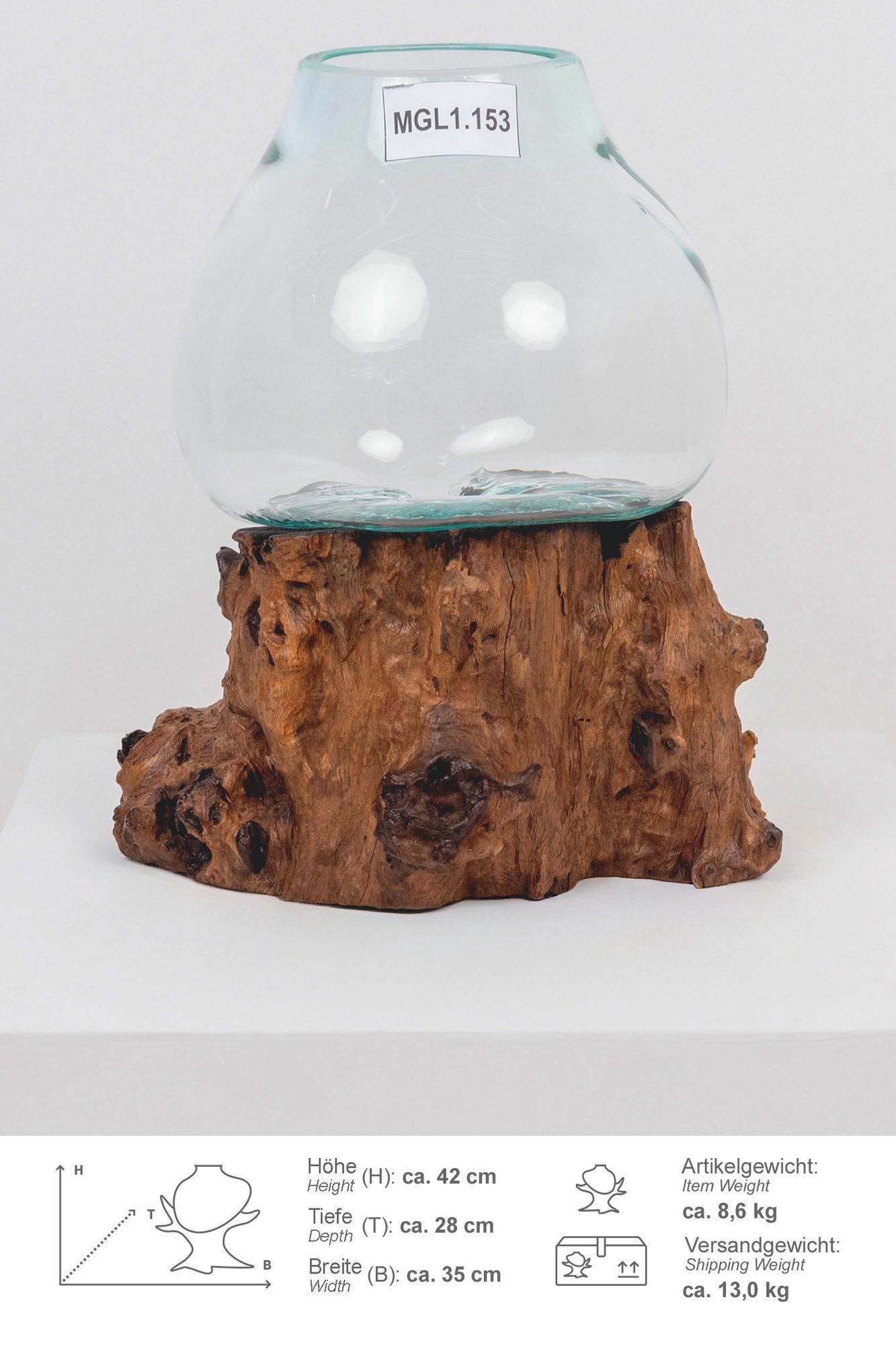 Glas Vase auf Wurzel Teakholz L 35 - 40 cm Glasvase